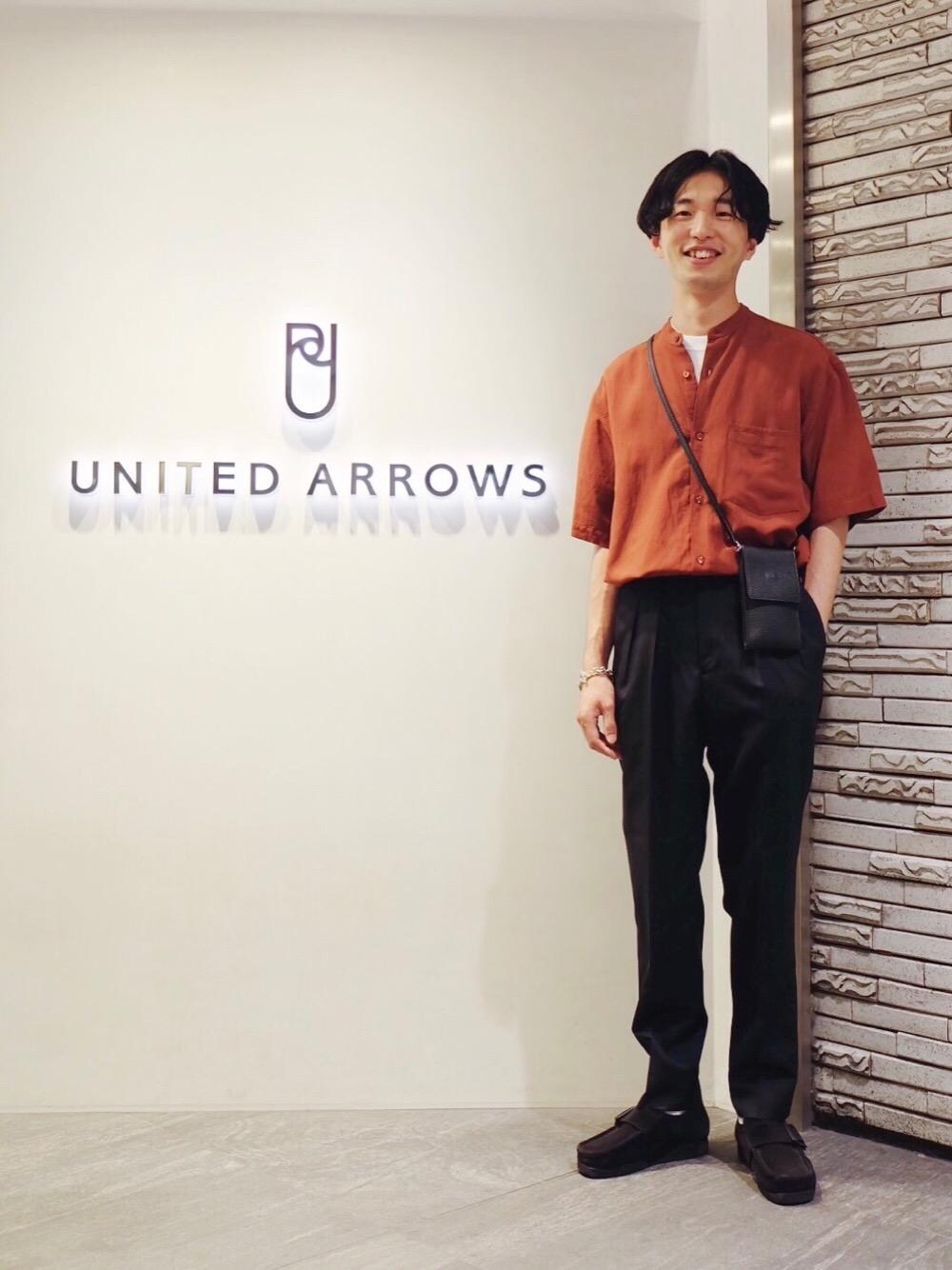 リラックス感のあるバンドカラーシャツを、2プリーツのパンツにタックインしてすっきりまとめました。