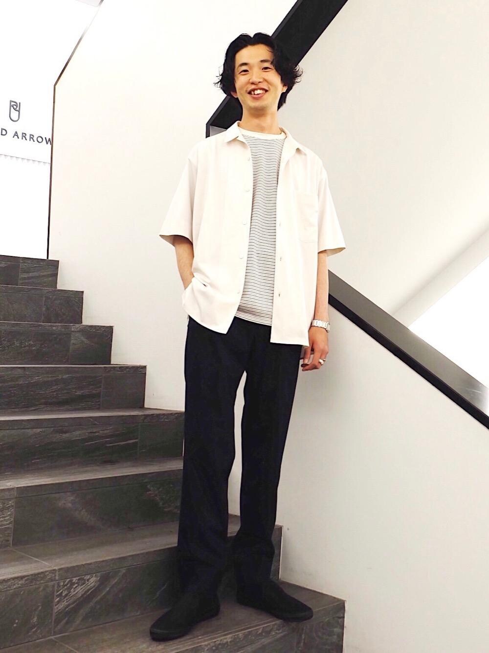 ジャージー素材のオープンカラーシャツは、長めの袖幅とドロップショルダーが特徴でリラックス感のある着心地が楽しめます。ドレープ感のあるパンツとあわせて上品なカジュアルスタイルを演出しました。