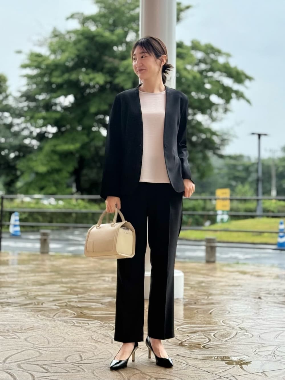 【サイズ感】 ジャケット:標準的 インナー:標準的 パンツ:標準的 【コーディネートポイント】 シアサッカーのセットアップにインナーをサテンブラウスにして涼しげなビジネスコーディネートにしました。前身夏の素材のアイテムなので真夏のお仕事着にオススメです。インナーのブラウスはオンオフどちらでもお使いいただけます。
