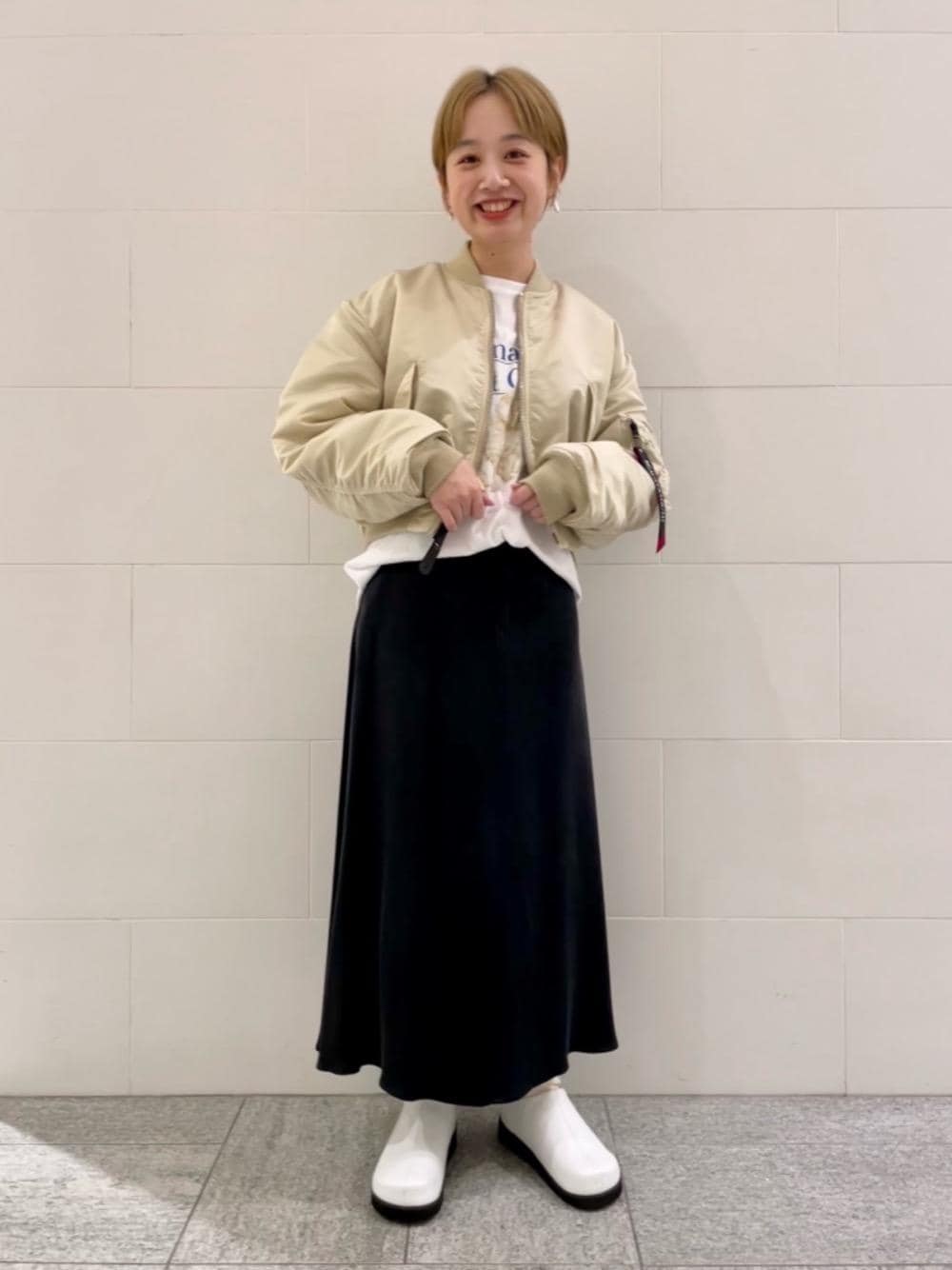 ・身長:158cm ・普段サイズ:トップスFREE/ボトムス S-M/シューズ 24.5-25.0cm 【サイズ感】 トップス:ゆったり アウター:ゆったり スカート:腰回りすっきり シューズ:普段サイズ 【着心地】 大人気のマーメイドラインスカートはサラリとした肌触りでロングシーズン着用できるアイテムです。 プリントが目を惹くthe open productの別注Tシャツは、肌離れがいいとろんとした薄手の素材のため、初夏まで着用できます。 【コーディネートのポイント】 フェミニンなスカートに、今季オススメのMA-1、クロッグシューズを合わせました。 MA-1はショート丈の着丈で、後ろにボリュームを持たせてお作りした別注アイテムです。コーディネートに取り入れるだけでグッと今年らしい雰囲気になります。