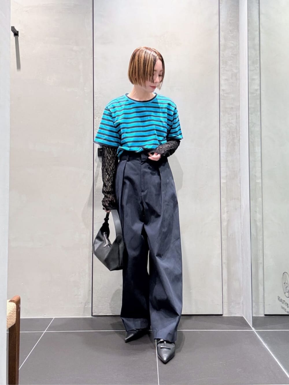 ●身長:156cm ●普段サイズ:トップスS/ボトムスXSorS/シューズ23cm 【サイズ感】 トップス:フリーサイズ /ゆったり インナー:フリーサイズ/標準 ボトムス:S/標準 シューズ:23.5cm/標準 【コーディネートポイント】 ボーダーとレーストップスをレイヤードした遊び心のあるコーディネートです。