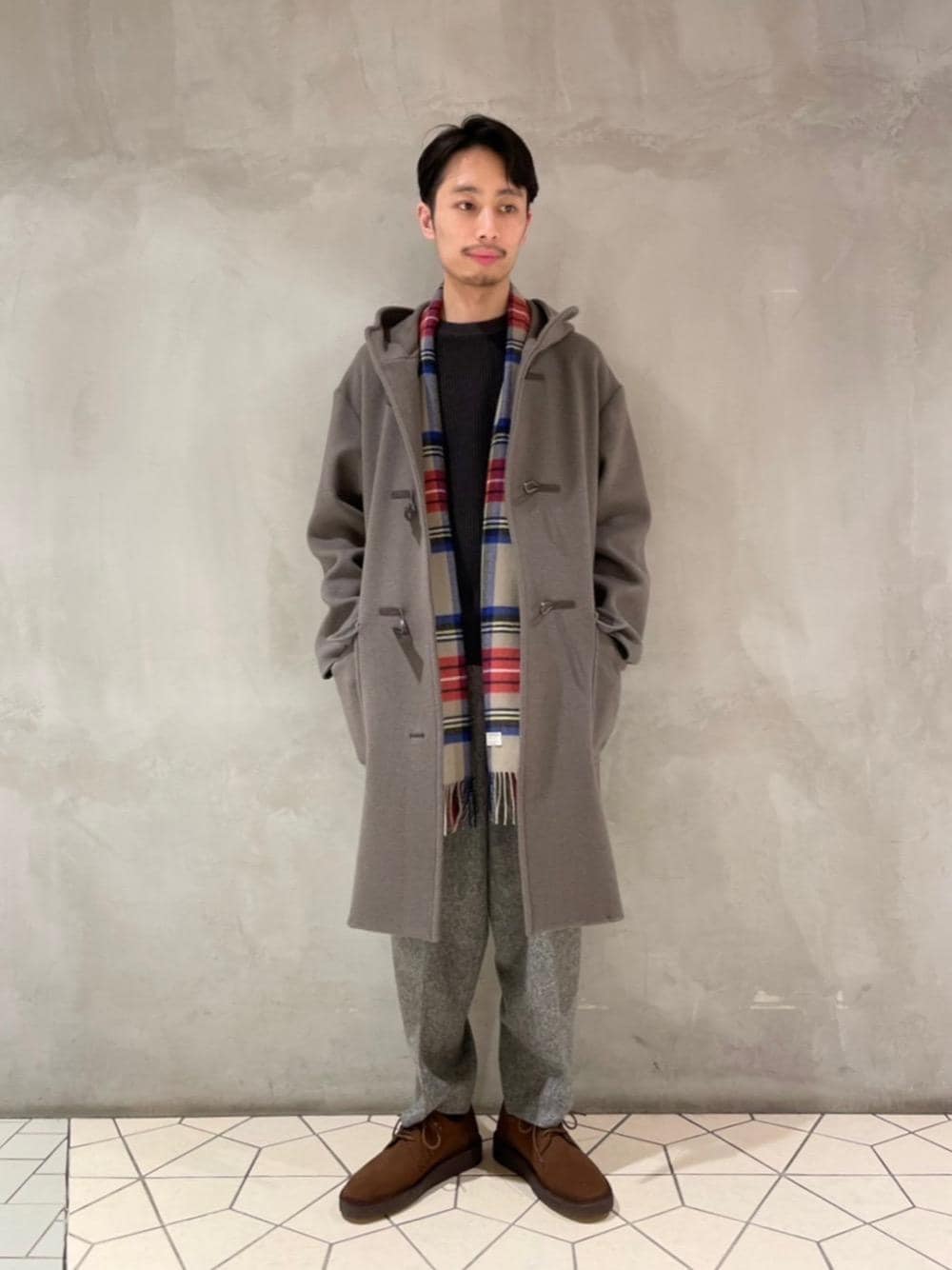 20代後半 身長:167cm 普段サイズ:トップス S/ボトムス S/シューズ 26cm 【サイズ感】 アウター:ゆったり トップス:ぴったり ボトムス:ゆったり シューズ:ぴったり 【素材感】 アウター:軽めのメルトンウール生地 トップス:洗えるウール生地 ボトムス:柔らかいウール生地 【コーディネートポイント】 キレイめなアイテムをまとめて品のあるコーディネートを意識しました。カラーはグレーやブラウンなど落ち着いた色味を合わせ、クリスマス感のあるマフラーをワンポイントで垂らしてみました。