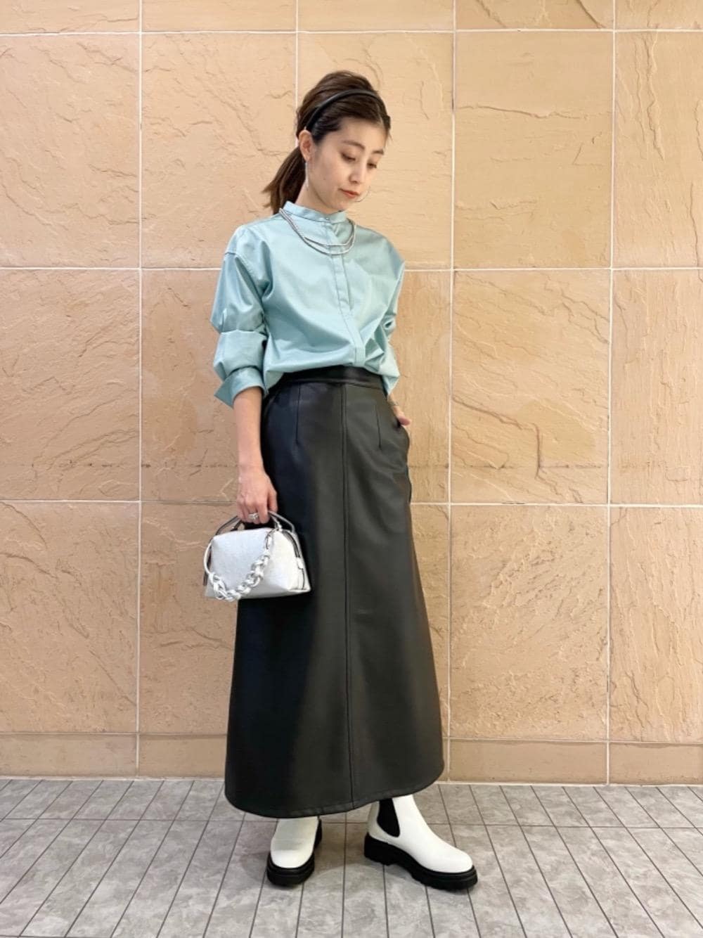 [身長] 158cm [普段サイズ] トップスXS(34)/ボトムスXS(34)/シューズ22.5cm [サイズ感] トップス:ゆとりあり スカート:標準的 シューズ:標準的 [素材感] トップス:なめらかな肌触り スカート:上質なレザー [着心地] トップス:ほどよくゆとりがあって着やすい スカート:レザーだが重さはなくはきやすい シューズ:足首まわりが細身 [コーディネートポイント] ミントカラーのシャツをメインに、クリーンな印象になるようにコーディネートしました。スカートやカチューシャなど女性らしさもプラスしました。