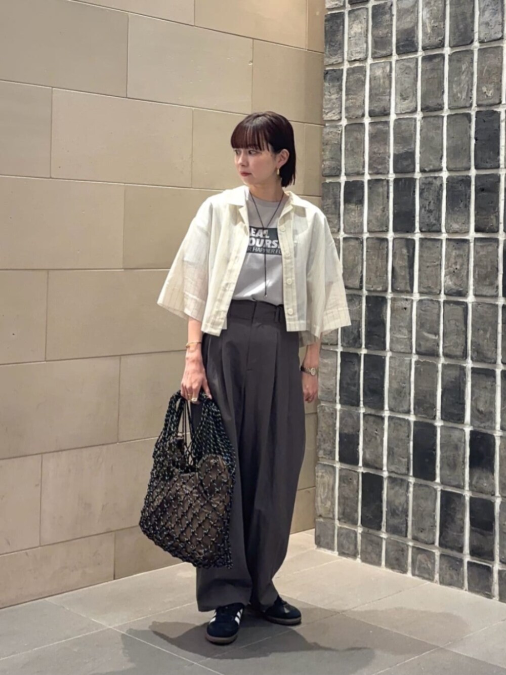 身長:158cm 【着用サイズ】 ・シャツ/FREE ・Tシャツ/FREE ・パンツ/Sサイズ 【サイズ感】 ・シャツ/標準 丈は短め ・Tシャツ/標準 ・パンツ/標準 腰回り以下はややゆったり ・シューズ/普段通りのサイズで丁度良い 【コーディネートポイント】 ロゴのTシャツにシャツを合わせて少し綺麗めな印象にしました。