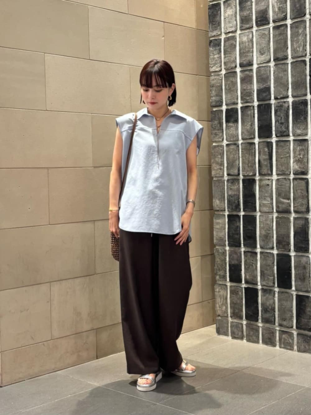 身長:158cm 【着用サイズ】 ・ブラウス/FREE ・パンツ/Sサイズ 【サイズ感】 ・ブラウス/ややゆったり ・パンツ/ややゆったり ウエストゴムで楽に履いていただけます ・シューズ/普段通りのサイズで丁度良い 【コーディネートポイント】 ライトブルー×ブラウンの色味で鮮度を出しました。 どちらも清涼感のある素材なので盛夏までオススメです。