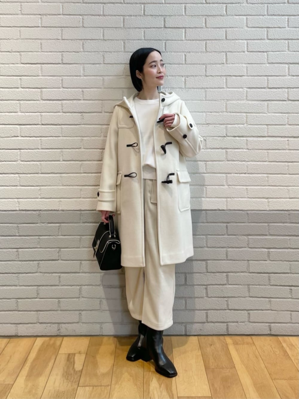 【サイズ感】 アウター:標準 トップス:標準 ボトムス:標準 ※サイズFREEウエストゴムですが、通常34・36着用だとあまりを感じる 【素材感・着心地】 アウター:しっかりと厚みがあり暖かな素材感 トップス:なめらかな表面で着心地がよい ボトムス:凹凸のあるコーデュロイ素材、着心地がよい 【コーディネートポイント】 ホリデーシーズンのすすめのホワイトコーディネート。 ホワイトのダッフルコートは、大人フェミニンなコーディネートにも相性◎です。 ダッフルコートのトグル(留め具)の色見と合わせて、バッグとシューズもシックなブラックにしてコーディネートを締めました。
