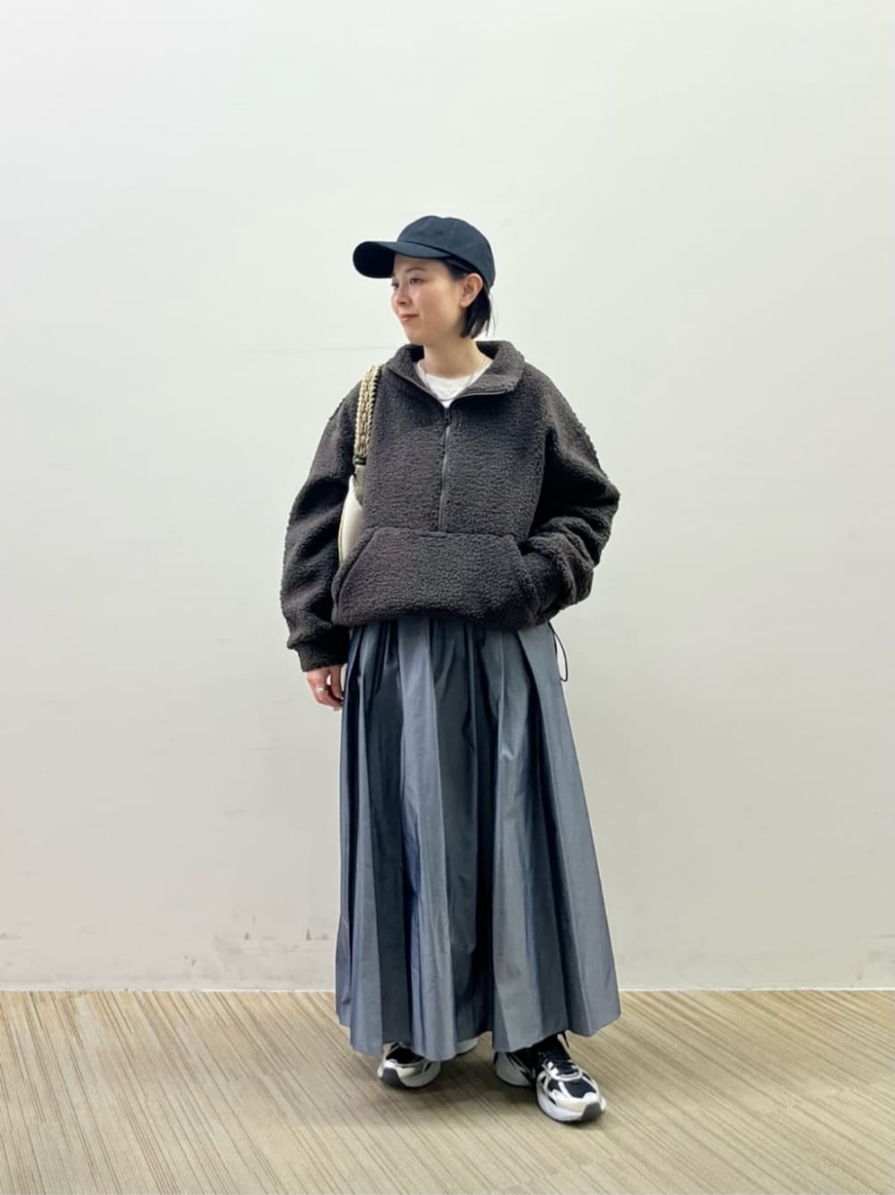 【サイズ感・素材感】 トップス:ゆったり。1〜5枚目、裾のドロスト紐を締めて着用しました。 ボア素材で、ふっくらとした柔らかい手触りが特徴です。 スカート:Sサイズで標準的。ウエストバックゴム仕様、サイドジップが付いているので着脱しやすいです。 ハリのある素材を使用しております。 【コーディネートポイント】 近場の旅行やお出かけをイメージし、リラックス感のあるアイテムを選びました。 カジュアルなアイテムにスカートを合わせて、女性らしさを足しました。