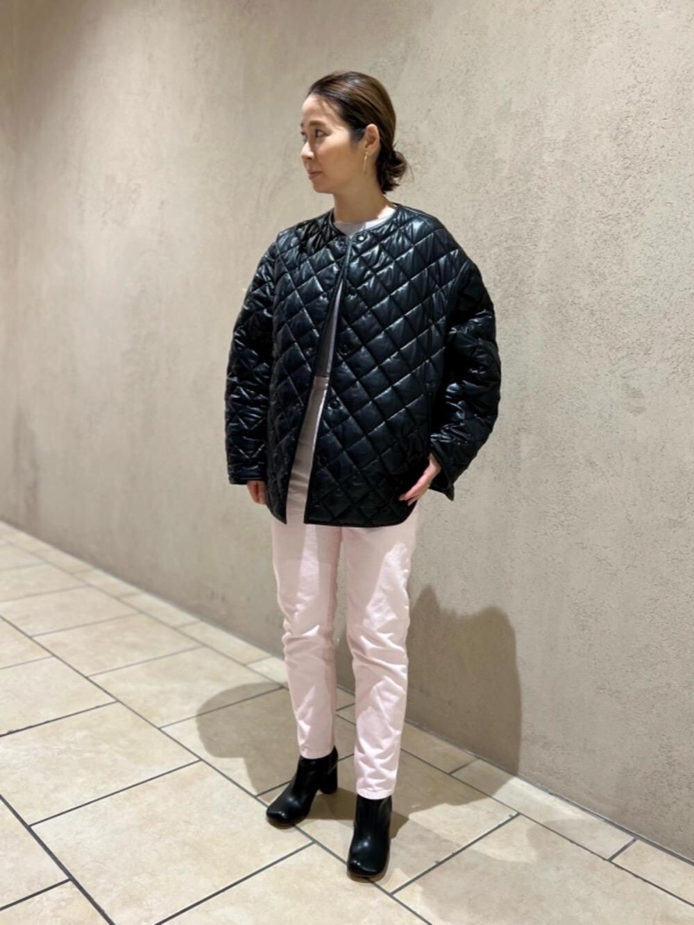 ●身長:163cm ●普段サイズ トップス S size ボトム S size or M size シューズ 23.5cm 【サイズ感】 ・アウター:ゆったり ・トップス:標準的、伸縮性有り ・パンツ:Sサイズ/標準的 ・シューズ:標準的 【素材感・着心地】 アウター:オーバーシルエットのキルティングジャケット。程よい光沢感があります。 トップス:カップのついたベロア調のトップス。手洗い可能です。