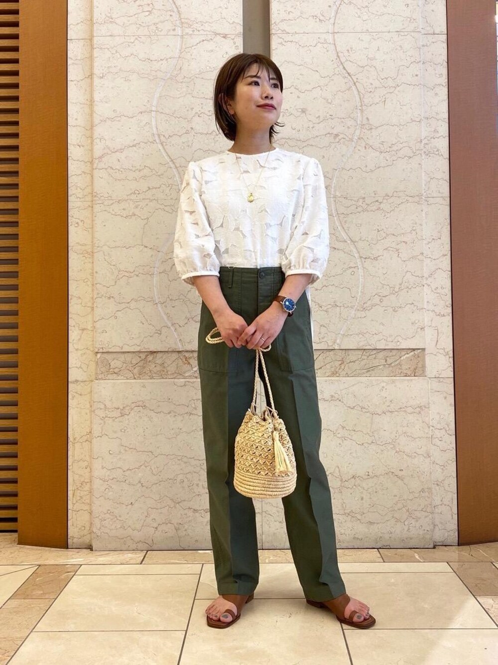 綺麗めなブラウスにベイカーパンツとサンダルを合わせて、カジュアルなスタイリングにしました。カーディガン要らずな五分袖且つ、生地に奥行きと透け感もあり、軽やかな印象でお召しいただけます。