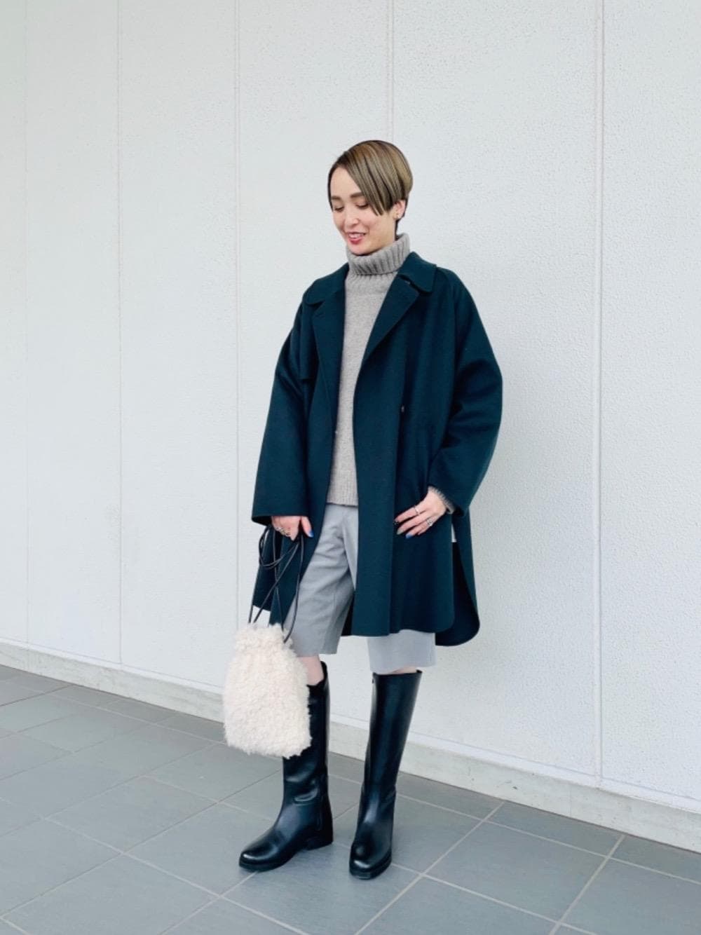 身長:161cm 普段サイズ:トップス/Sサイズ ボトムス/S.Mサイズ シューズ/23cm 【サイズ感】 ・アウター:ゆったり。ミドル丈 ・トップス:少しゆったり。 ・パンツ:標準的 【素材感、着心地】 ・トップス:カシミヤ混で肌ざわり良いです。首回りもチクチクしません。 ・パンツ:ポリエステルで洗える素材です。柔らかく履き心地良いです。 【コーディネートポイント】 ・ミドル丈のポンチョとロングブーツでバランスの良いコーディネートにしました。インナーのコーディネートはトーンを合わせて柔らかい印象にまとめました。