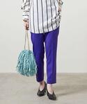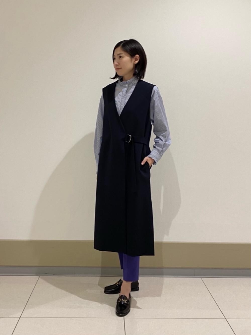 ●身長:166cm ●普段サイズ:トップス 36/ボトムス 36/シューズ 23.5cm 【サイズ感】 トップス:ゆったり ボトムス:標準的 ロングジレ:ゆったり 【素材感・着心地・シルエット】 トップス:フリルがアクセントになっており、レイヤードのコーディネートが楽しめます。 ボトムス:タイトですが、脚のラインを拾わない程よいシルエットです。 ロングジレ:ウエスト部分にボタンとベルトがついているので、留めて着て頂くとすっきりとした着こなしになります。