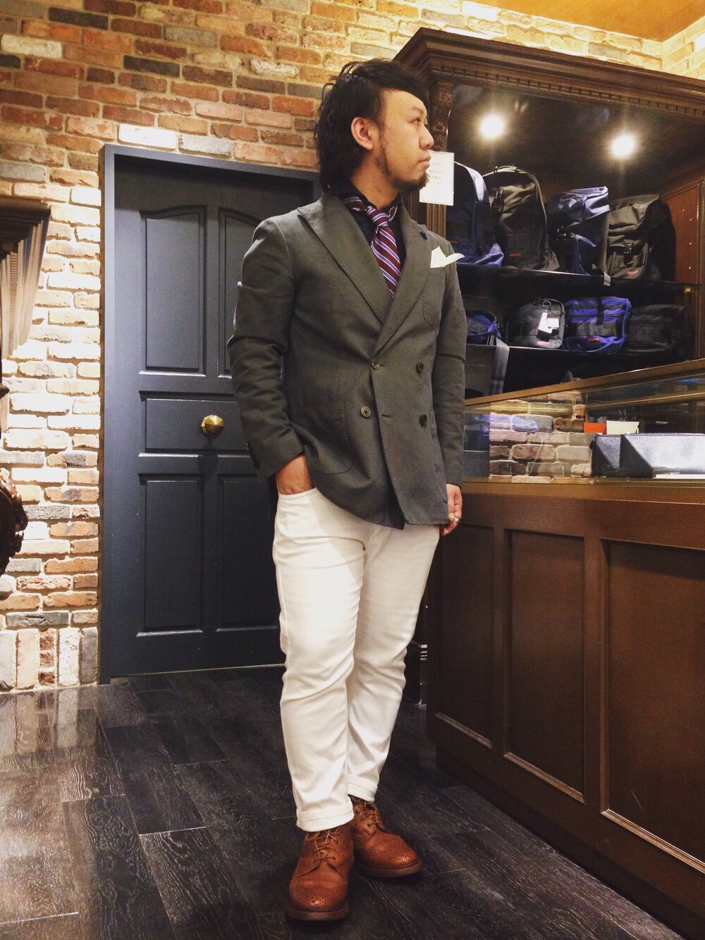 ジャケット: LARDINI シャツ: GIANNETTO ネクタイ:BROOKS BROTHERS チーフ:nano・universe パンツ: Lee シューズ:TRICKER'S 時計:HAMILTON