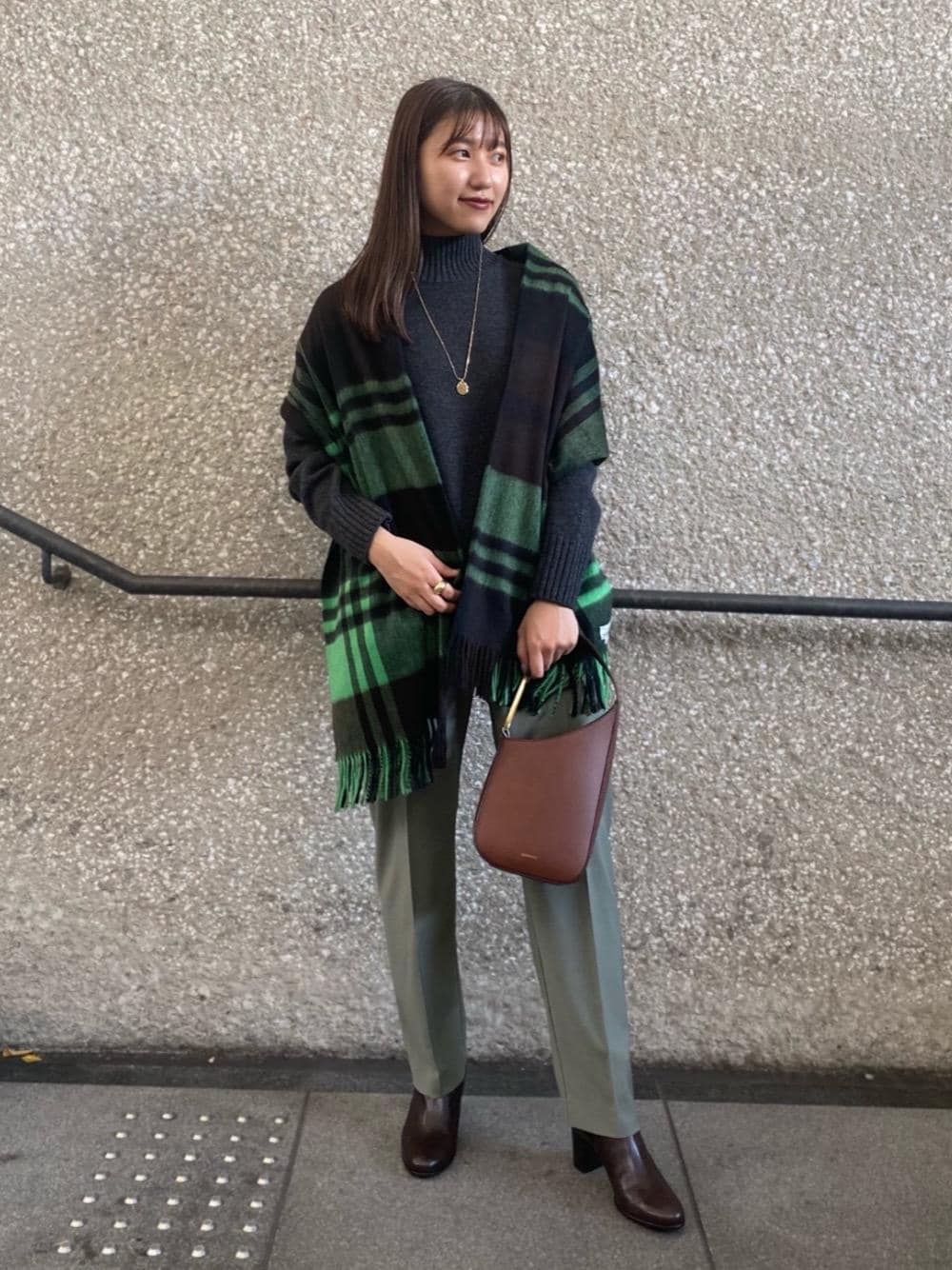 ●身長:164cm ●普段サイズ:トップス38/ボトムス36or38/シューズ24.5cm<幅広め> 【サイズ感】 トップス:ややゆったり ボトムス:ゆったり シューズ:標準的 【素材感・着心地】 トップス:厚すぎず薄すぎない、程よい肉感でふんわりとした着心地。 ボトムス:ウール混ですが、さらっとした軽い着心地。 【コーディネートポイント】 肩周りの落ち感が綺麗なハイネックニットは、程よい肉感ですっきりとした印象に。柔らかいオリーブカラーのパンツ合わせで秋を意識したコーディネートにしました。<Joshua Ellis>のストールは大判なので、肌寒い季節にニットや、カットソーの上に羽織るだけのスタイリングもおすすめです。