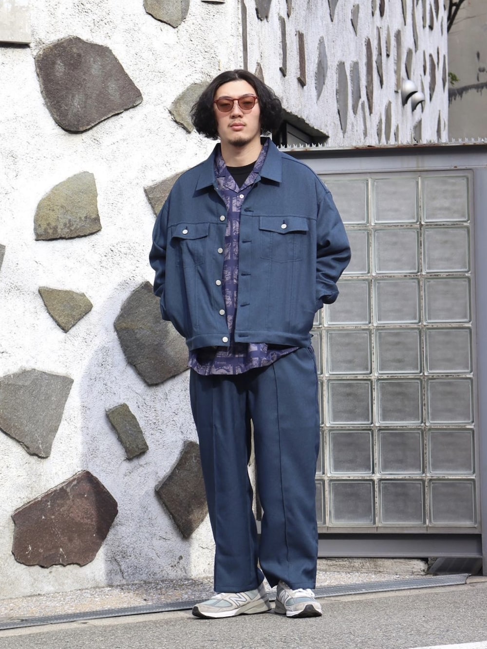 スタプレのセットアップを着用しパープルカラーのシャツを中に着用し同色コーデにしています。
