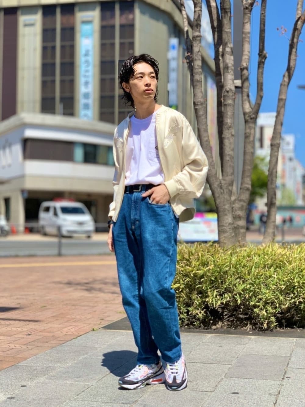 Instagram →ur_hmj_ytkskmk workday coordinate ザ・90's ストリートスタイル✨ サテン地のブルゾンにしっかり色落ちした緩いテーパードのデニムを合わせ、インナーのTシャツはタックイン。これぞ懐かしのストリートスタイルを現代的なブランドとデザインでアップデートしました😊 髪型まで意識してスタイリングしました笑 Instagram,WEARのフォロー いいね❤、お気に入り登録➕ お願いします!!