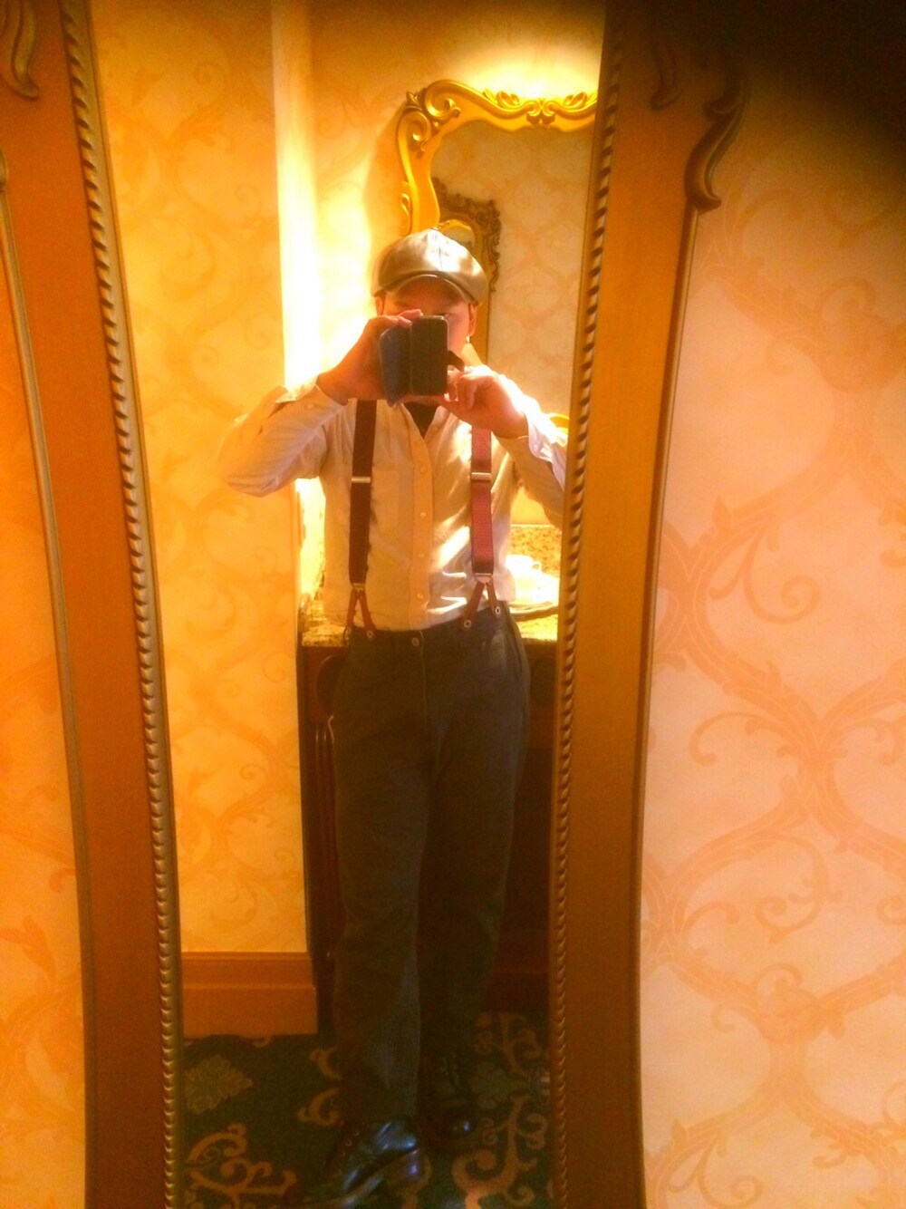 ディズニーシーで家族サービス❗️ 写真があんまりうまく取れない(ー ー;) 50sを意識しました。 クラシカルワークスタイル(^O^) サスペンダーは短かったので、リメイクしたので、オリジナルです(*^^*)