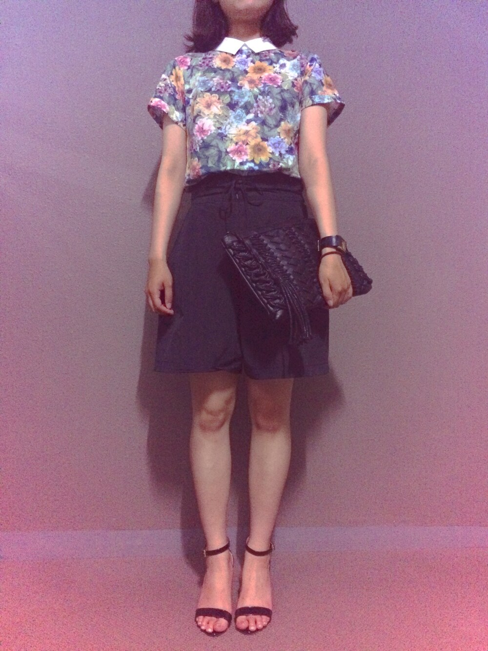 久しぶりです また花柄のトップス着ました🌻 ショートパンツが少年っぽくなるので、クラッチバッグにミュール、黒で大人に統一しました。 ショートパンツはセール価格で安く手に入りました〜〜
