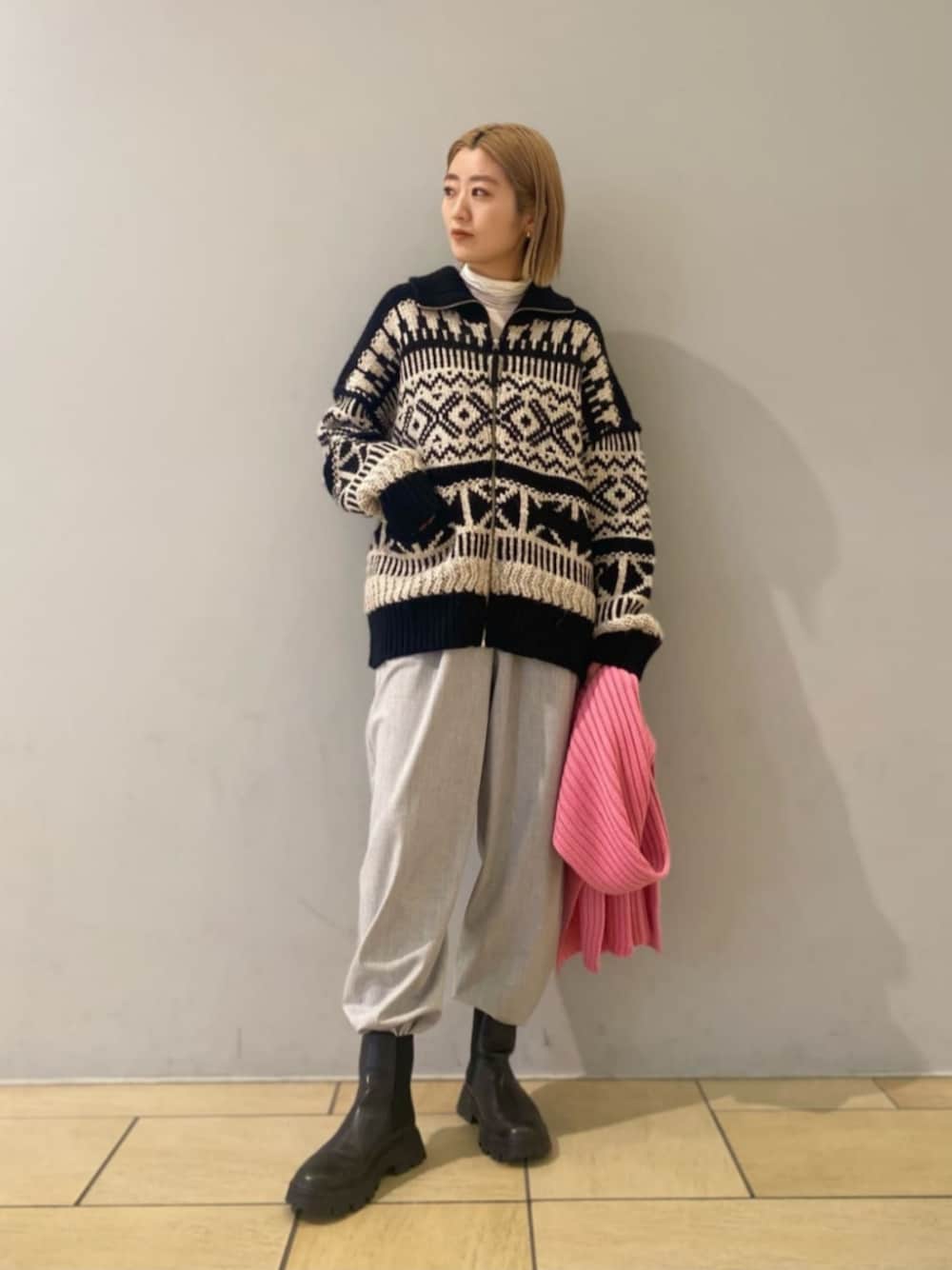 【サイズ感】 トップス:オーバーサイズなので、アウター感覚で着れます! ボトムス:やや丈長めなので、たるませて履くのが◎ 【コーディネートのポイント】 カウチンカーディガンを主役にコーディネートしました。ブーツインやストールを差し色にしてメリハリをつけています。