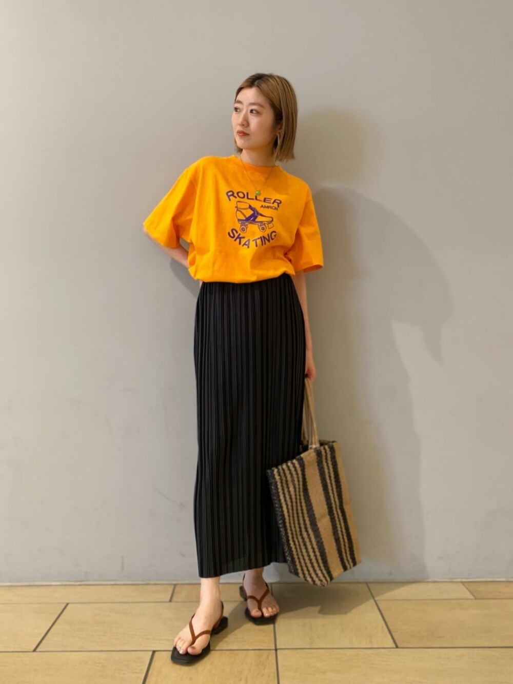 【サイズ感】 トップス:ゆったりめ スカート:標準・伸縮性あり足捌き◎ シューズ:標準 【コーディネートのポイント】 パキッとオレンジが目を引くAmericanaのTシャツを主役にコーディネートしました。艶感のあるスカートと華奢なサンダルが、カジュアルながらも女性らしさを演出してくれます。
