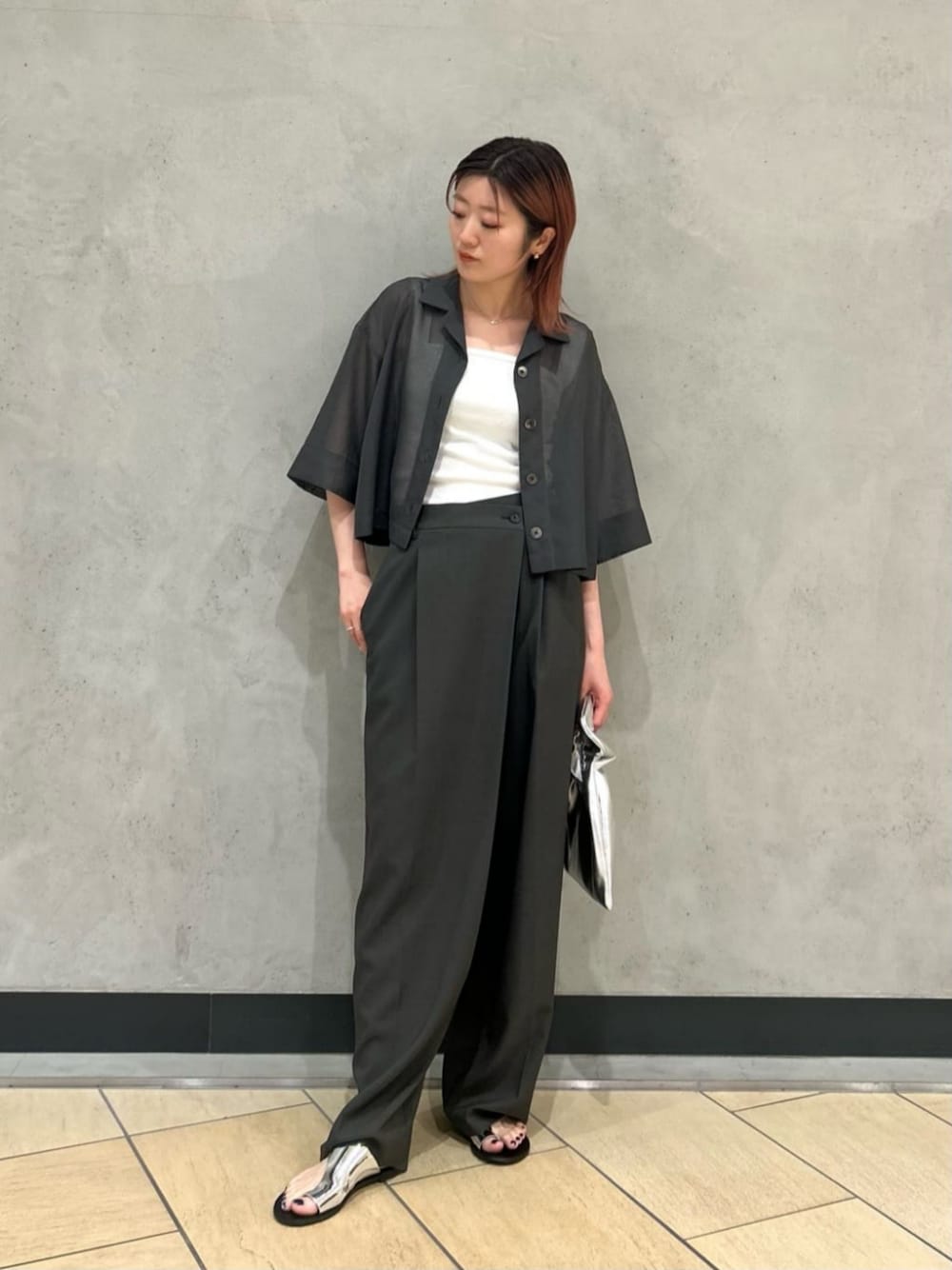 【サイズ感】 シャツ:ワイドな身幅/ショート丈 ボトムス:ゆったり/オーバーに着たかったのでMサイズを着用 シューズ:標準 【コーディネートのポイント】 セットアップ風にコーディネートしました。本来は別々のアイテムなのでかっちりしすぎず、シアー素材が抜け感を演出してくれます。