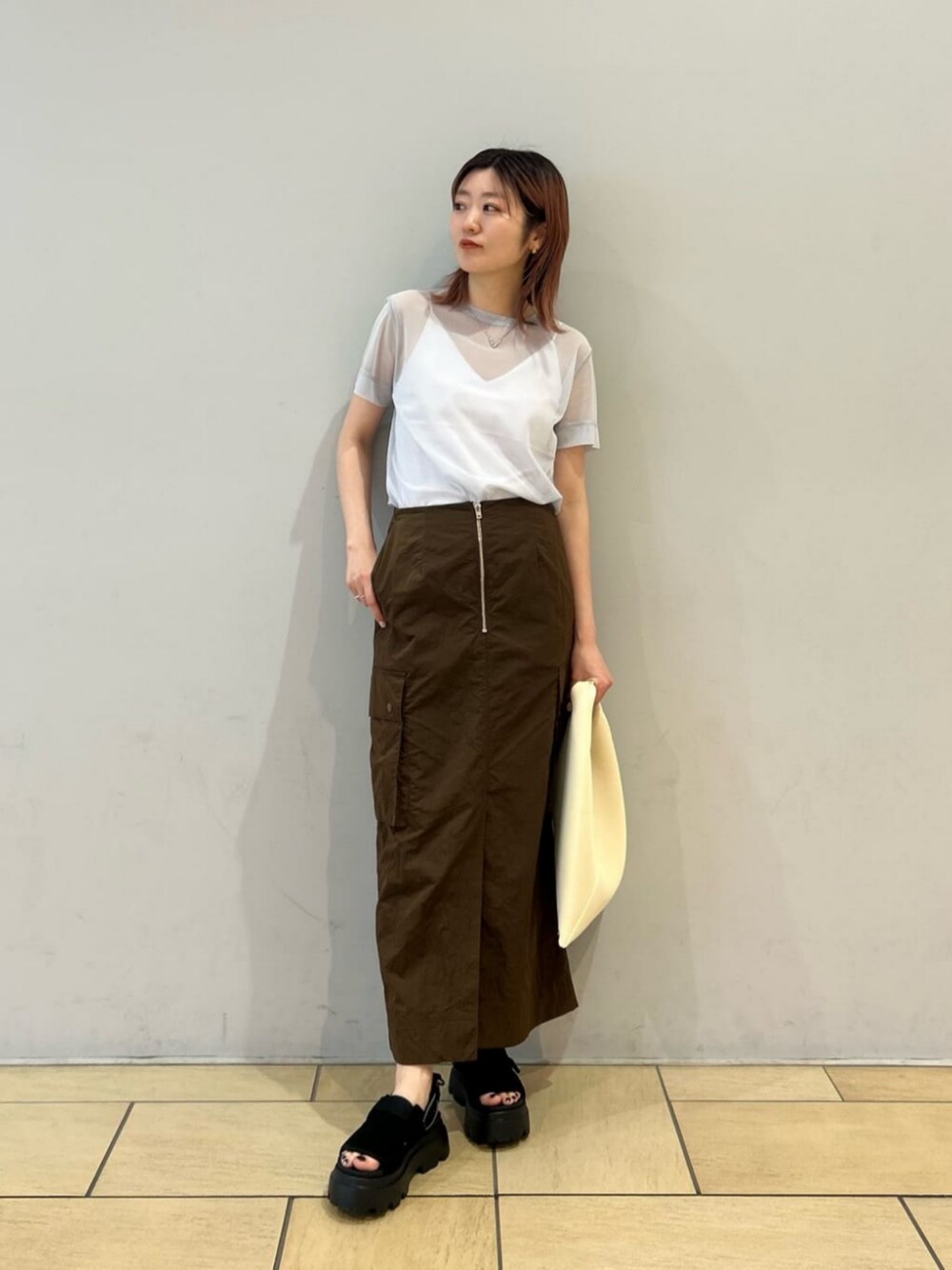 【サイズ感】 トップス:ややすっきりめ スカート:標準 シューズ:大きめので通常よりワンサイズ下げました 【コーディネートのポイント】 ナイロン素材にヴィンテージ加工を施したスカートを主役にコーディネートしました。タイトなシルエットで合わせ、女性らしいムードにまとめました。
