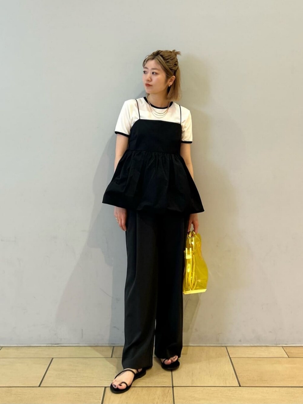【サイズ感】 トップス:ややコンパクト キャミソール:バスト調整可能 ボトムス:標準 シューズ:標準 【コーディネートのポイント】 甘いアイテムに抵抗があるお客様にもおすすめのコーディネートです。モノトーンで合わせることで甘さを抑え、キャッチーなバッグでスパイスを加えました。
