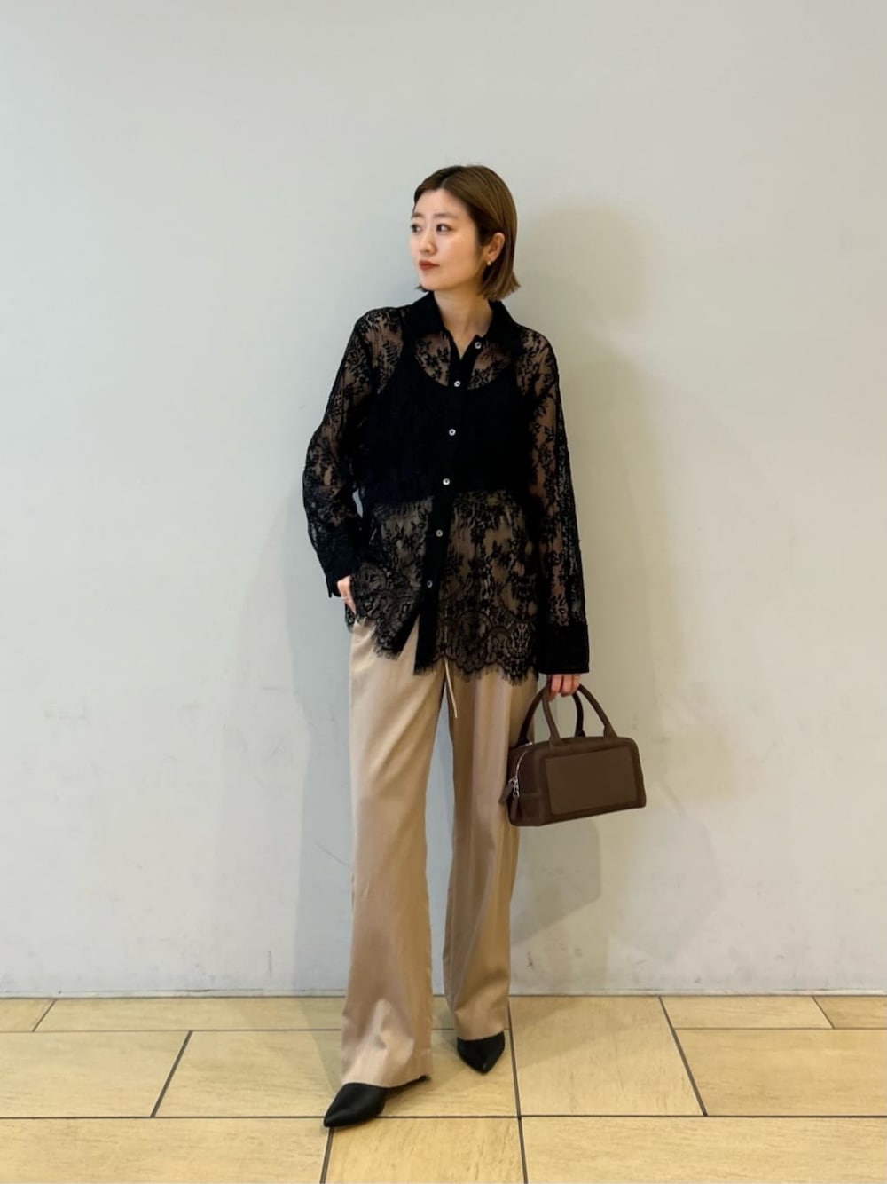 【サイズ感】 トップス:ヒップにかかる丈感 ボトムス:ヒールで合わせたかったので普段より大きいサイズを履いています シューズ:標準 【コーディネートのポイント】 黒のレースシャツをサテンパンツと合わせて、シックにコーディネートしました。パンツは綺麗めな表情ながらもウエストがゴムなので、カジュアルシーンにも幅広くお召しいただけます!