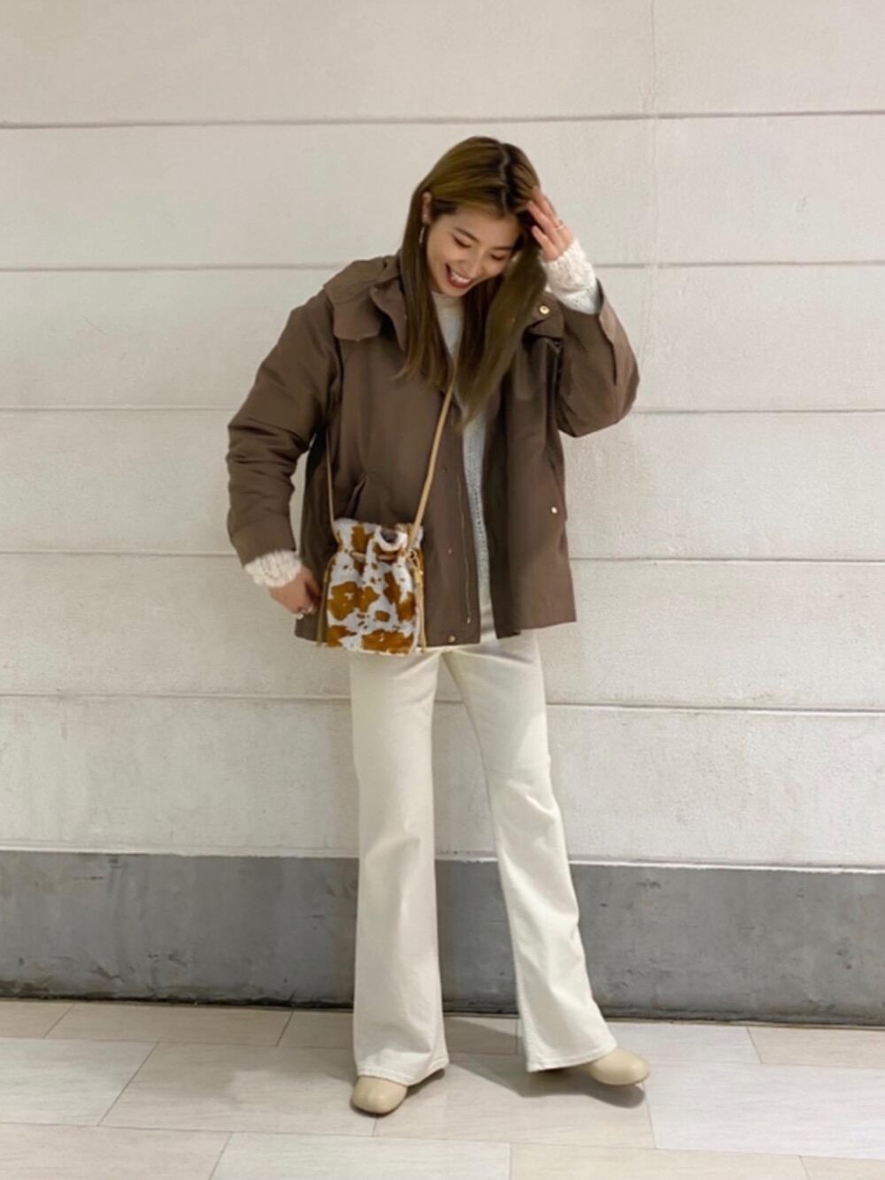 ・年齢:20代後半 ・身長:164cm ・普段サイズ:トップスM/パンツSM/シューズ23.5cm 【サイズ感】 アウター:やや大きめ/Lサイズ パンツ:標準/Mサイズ 【素材感】 アウター:本体コットン67%ナイロン33% パンツ:綿98%ポリウルタン2% 【着心地】 パンツはとても柔らかく履き心地が良いので、ストレス無く履いていただけます。 【コーディネートポイント】 アウターはスリーサイズ展開で、Mサイズも問題なく着用できますが、一番着丈があり、ボリューム感のあるLサイズをあえて選んでいます。 シンプルなホワイト×ベージュのコーディネートですが、足元はブーツで大人カジュアルなスタイリングにしました。