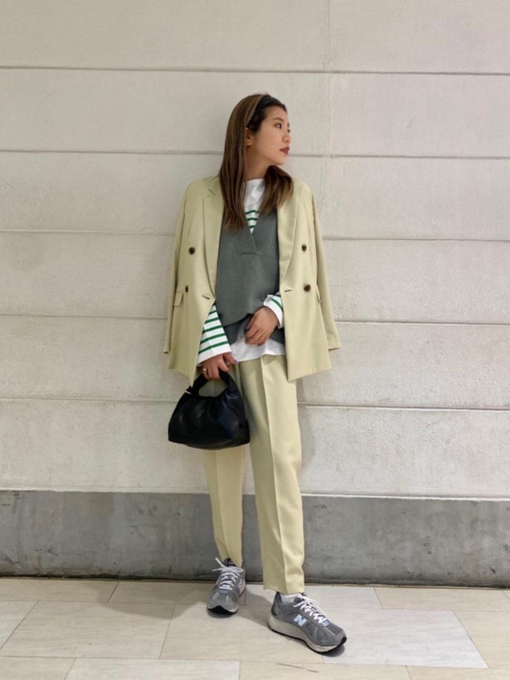 ・年齢:20代後半 ・身長:164cm ・普段サイズ:トップスM/パンツSM/シューズ23.5cm 【サイズ感】 ジャケット:標準/M パンツ:標準/M 【コーディネートポイント】 イエローカラーのセットアップで春先を意識したスタイリング。 グリーンのボーダーカットソーの上に少しワイドシルエットのベストを合わせたところがポイント。 本日から発売のnew balanceでよりオシャレに見えます。