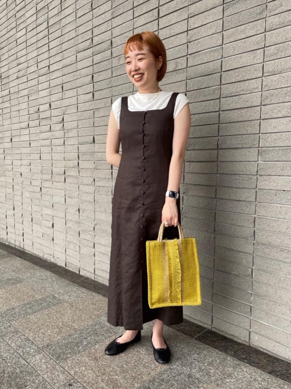 【身長】158cm 【普段サイズ】 ボトムス S ボトムス S シューズ 23.5cm 【サイズ感】 トップス:標準的 ワンピース:やや細身 シューズ:標準的 【素材感】 トップス:柔らかな麻混の素材 ワンピース:ハリのある麻素材 【着心地】 トップス:肌触りも柔らかく涼しく着用できます。 ワンピース:やや細身なシルエットですが、フロントスリットが施されており動きやすいです。 【コーディネートポイント】 細身なワンピースが綺麗に見えるように、インナーもコンパクトなアイテムを選びました。 全体的に色味が落ち着いていたので、差し色に綺麗なイエローカラーのBAGもポイントです。