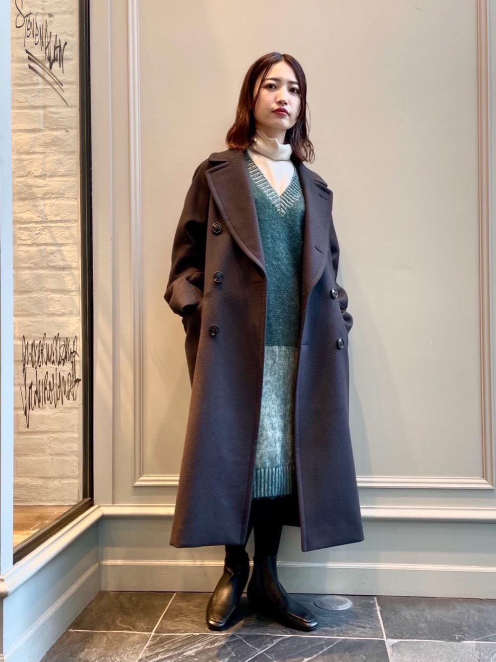 シャギーのVネックベストにロングPコートを羽織り、遊び心がありつつもどことなくオーセンティックな雰囲気の感じられるコーディネートにしました。ブラックのロングコートは、モードなスタイリングにもおすすめです。
