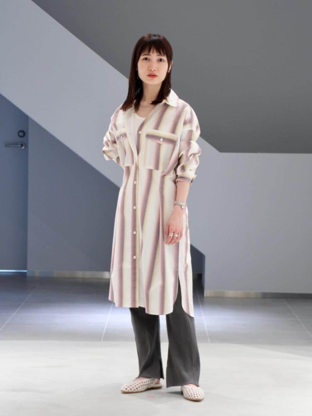 「UA NICE DAYS」開催中 2021年5月9日(日)まで ハウスカード会員様へ、期間中の累計お買上げ金額に応じて、最大10,000ポイントをプレゼントいたします。 ※弊社オンラインストア、店舗のみのキャンペーンになります。 <ISABEL MARANT ETOILE>のシャツワンピースは、ブランドらしいストライプの配色と、前後に入ったウエストのタックがポイントです。リブパンツをレイヤードし、リラックスした雰囲気をプラスしました。