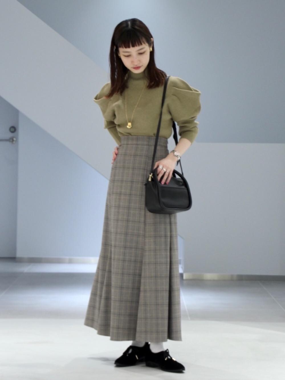 20代後半 身長155cm 普段サイズ トップスS/ボトムスS/シューズ23.5cm 【着用感】 ニット:柔らかく伸縮性のあるリブニット スカート:バックゴムで楽な履き心地、やや張りのある生地感 【コーディネートポイント】 女性らしい印象のボリュームスリーブニットとトラッドなチェック柄のフレアスカートを合わせて、秋のお出かけコーディネートを組みました! スモーキーなワントーンのコーディネートをベースに、ゴールドの大ぶりなアクセサリーとブラックの小物で、メリハリの効いたスタイリングに仕上げました。