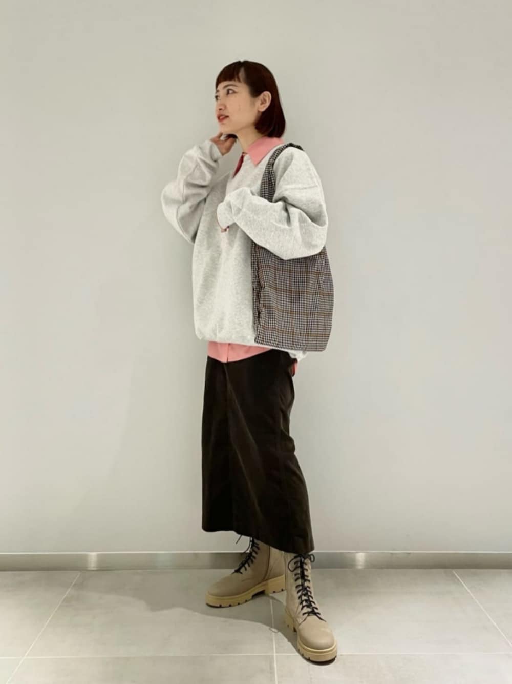 【着用感】 スウェット:裏起毛、オーバーサイズ シャツ:落ち感のあるさらっとした生地、丈長め スカート:ウエストボタンで調節可能 【コーディネートポイント】 オーバーサイズのスウェットにカラーシャツを合わせ、カジュアルなスクールガール風にコーディネートを組みました。 無地のアイテム同士の組み合わせなので、チェック柄のバッグや編み上げのブーツでポイントをつけました。