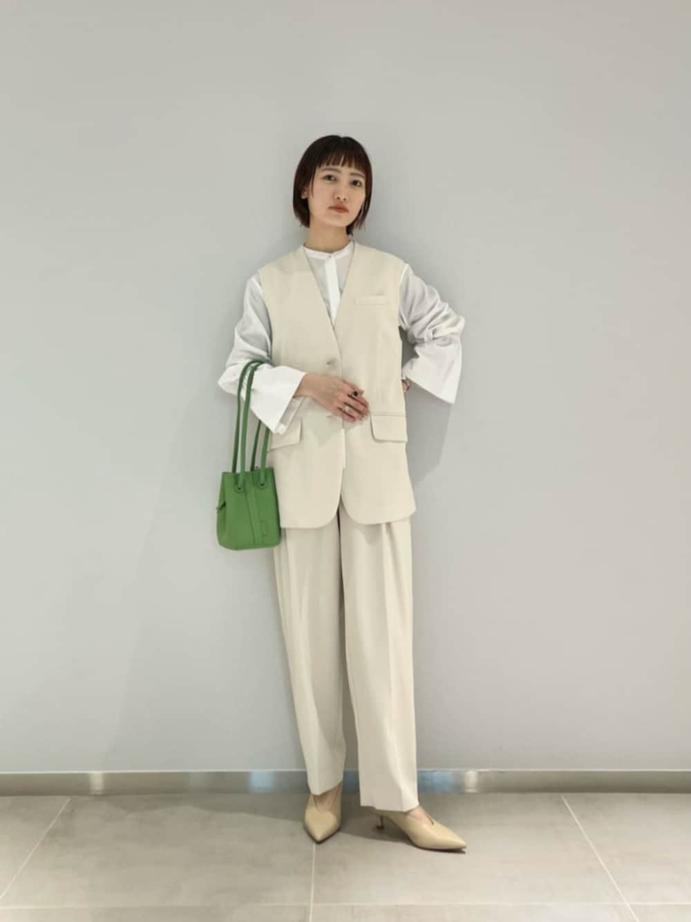 20代後半 身長155cm 普段サイズ トップスS/ボトムスS/シューズ23.5cm 【着用感】 ベスト:やや張りのあるツイル生地 シャツ:袖ゴム、大きめなサイズ感 パンツ:ライナー付き、太めのテーパードシルエット 【コーディネートポイント】 ポリエステルツイルのセットアップで、セレモニーシーンにおすすめのコーディネートを組みました。 ベストのインナーには、袖にポイントのあるシャツを合わせて華やかな雰囲気をプラスするのがおすすめです。