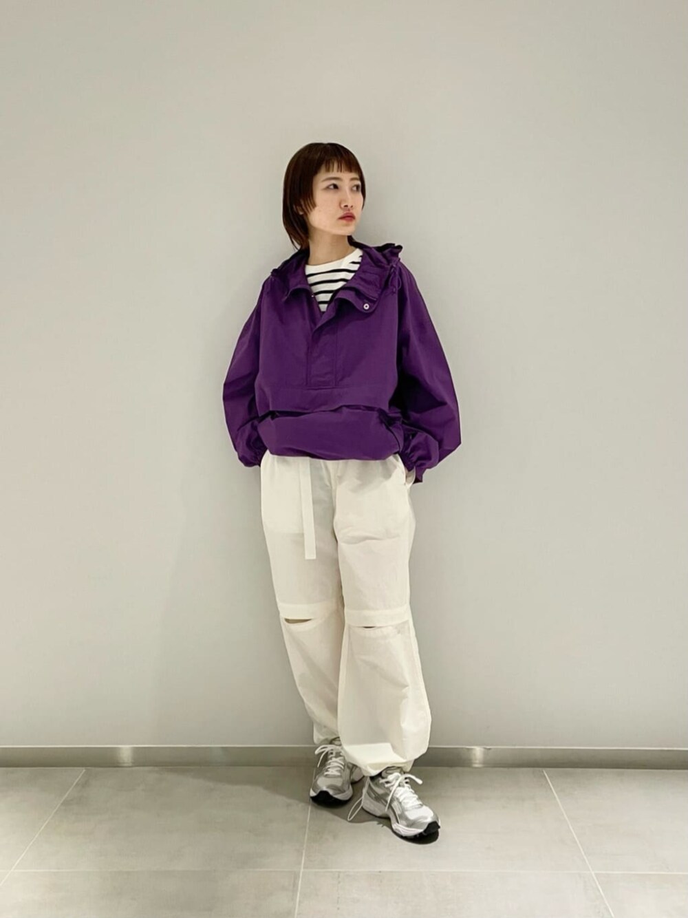 30代前半 身長155cm 普段サイズ トップスS/ボトムスS/シューズ23.5cm 【着用感】 パーカー:オーバーサイズ、軽い着心地 パンツ:ウエストベルトで調節可能、裾もドローコードで調節可能 【コーディネートポイント】 パープルのアノラックパーカーをメインにコーディネートを組みました。 トレンドアイテムの合わせで、スポーティですがどこかモードな雰囲気が感じられるスタイリングです。