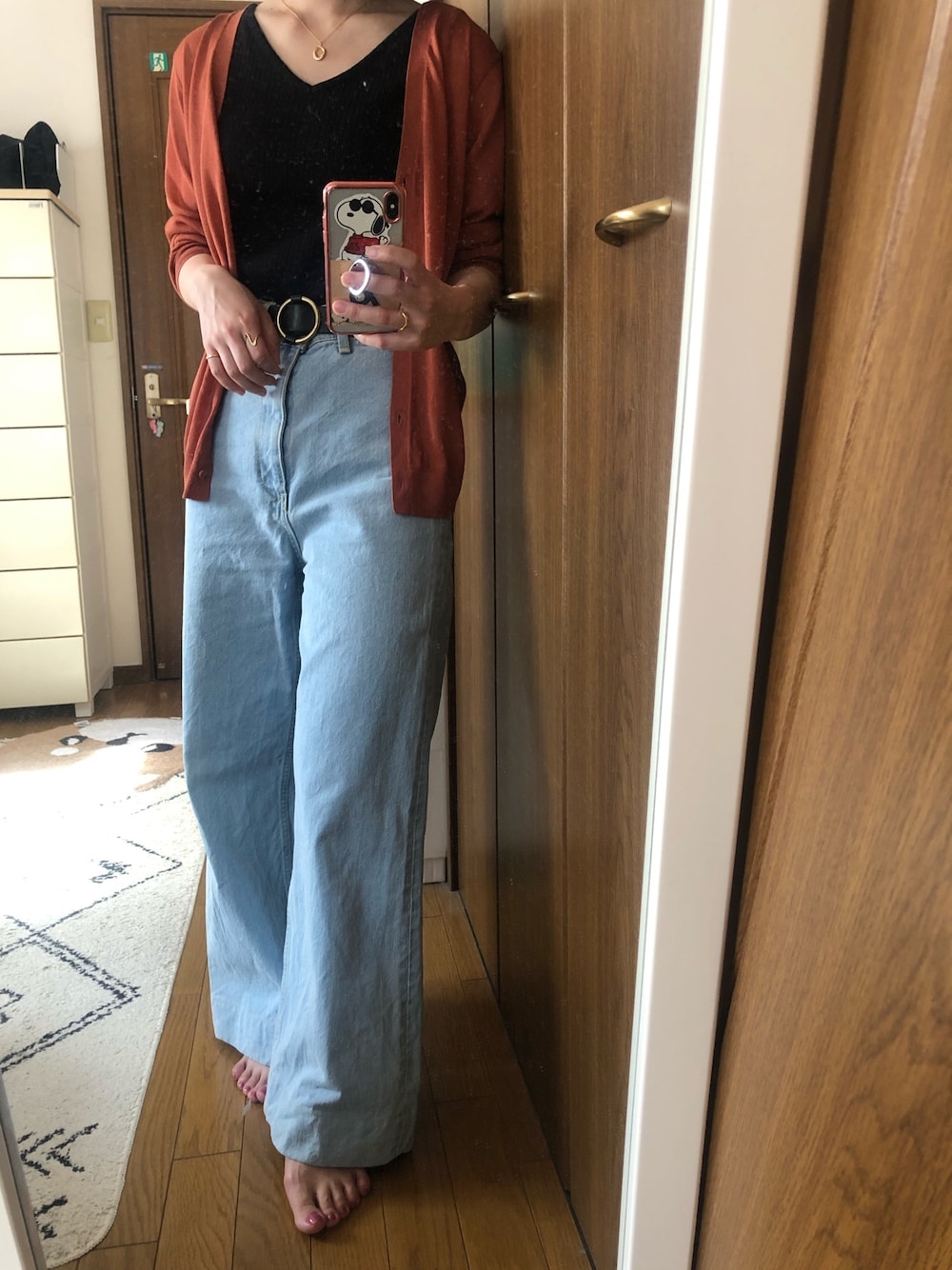 オレンジカーディガン 今日は休みで車移動だからシアーカーディガン