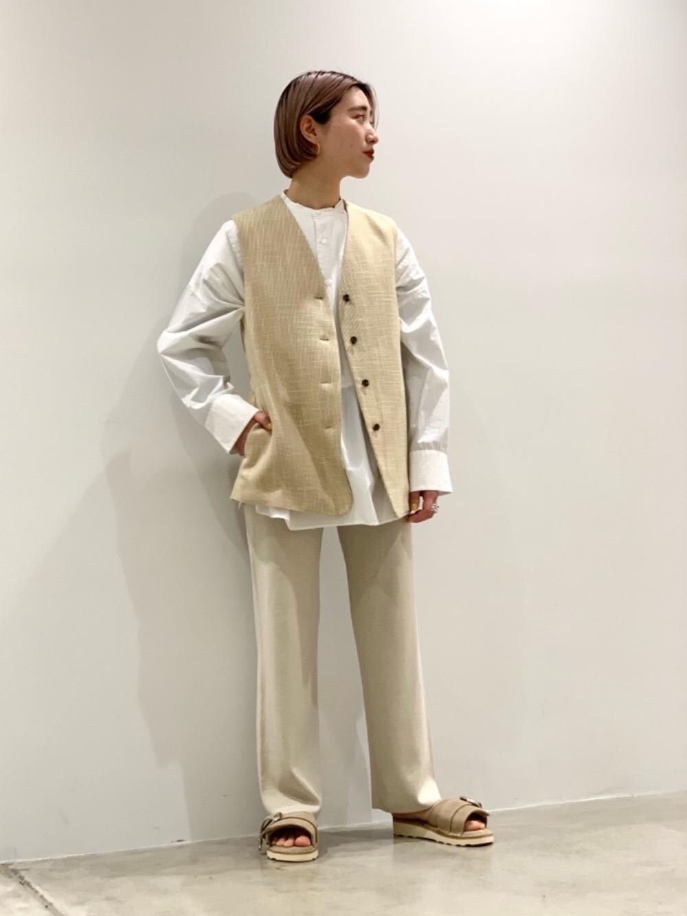 品のあるベージュのベストを主役に、全体的に柔らかいトーンでまとめました。マニッシュな印象のベストにニットパンツとサンダルを合わせることでカジュアルダウンしました。