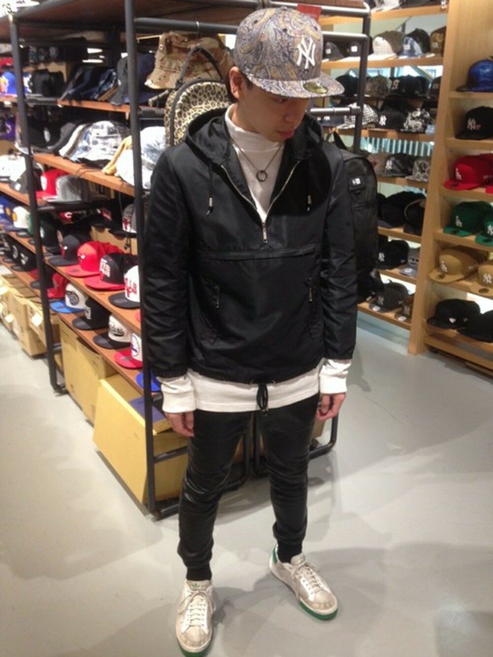 シンプルに白黒で合わせ、アクセントで渋めのペイズリー柄のキャップを被りました。 パンツはレザーにしたので少しだけ高級感が出るコーデになってます。