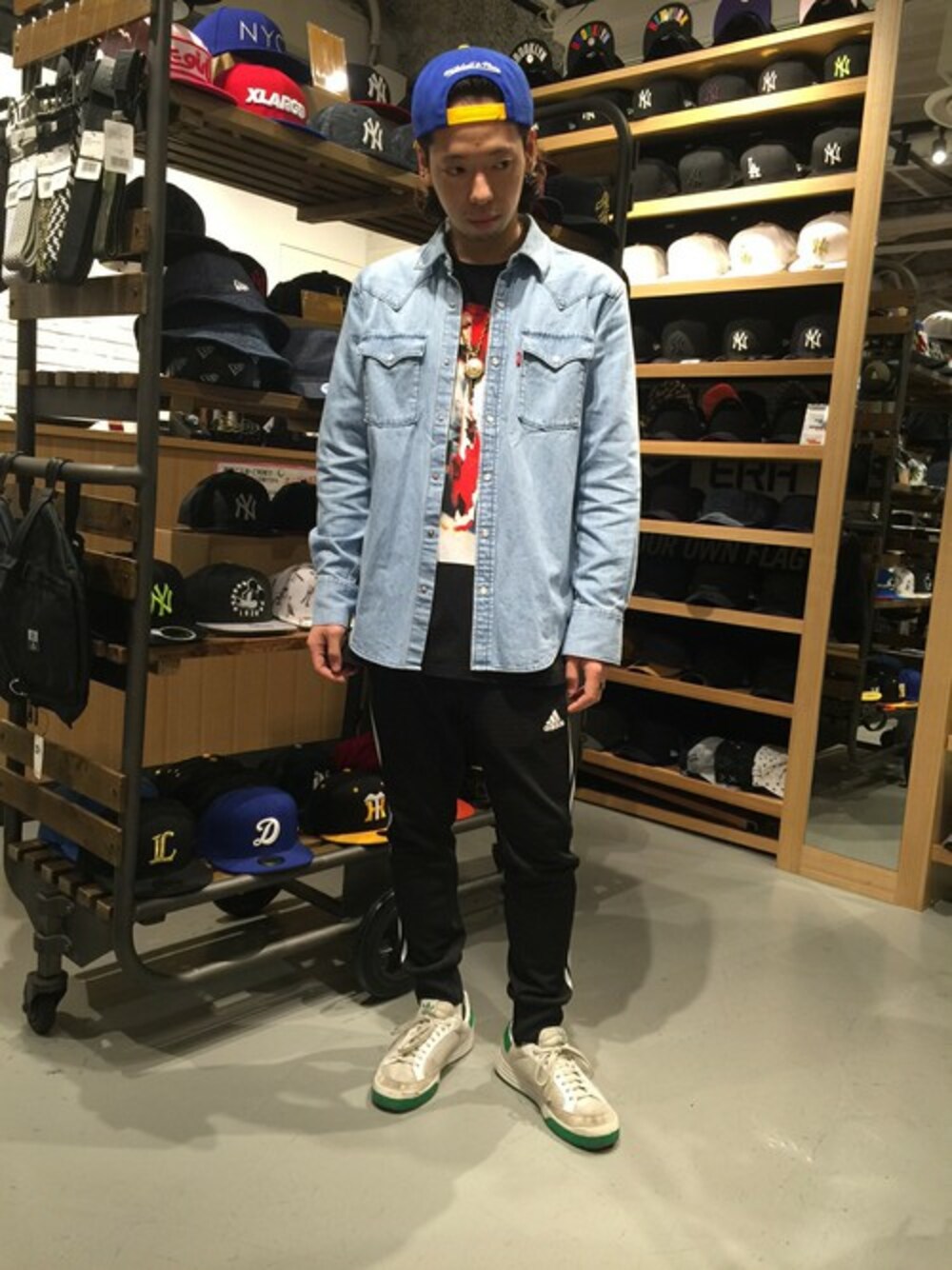 デニムでトレンドをつかみつつ、アディダスのパンツで少しだけラフな感じを出しました!キャップにはデニムにあわせ青にしてアクセントで黄色を入れ爽やかな感じにしました!
