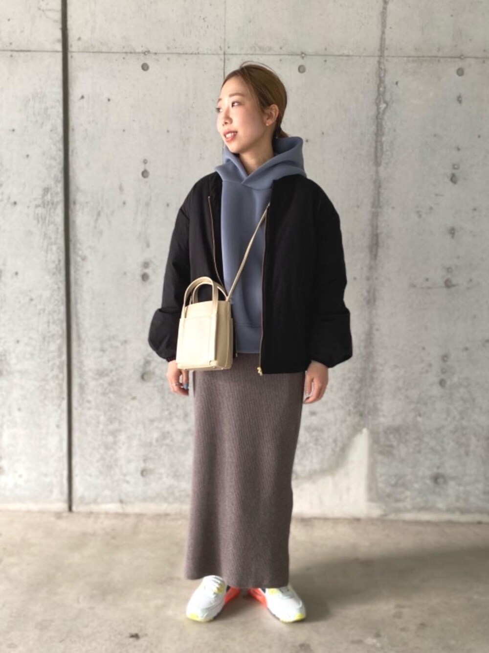 少しボリュームのあるダンボールフードにスッキリ目のリブスカートを合わせバランスをとりました。 軽くてカジュアルすぎない風合いなので女性らしく合わせていただけます。