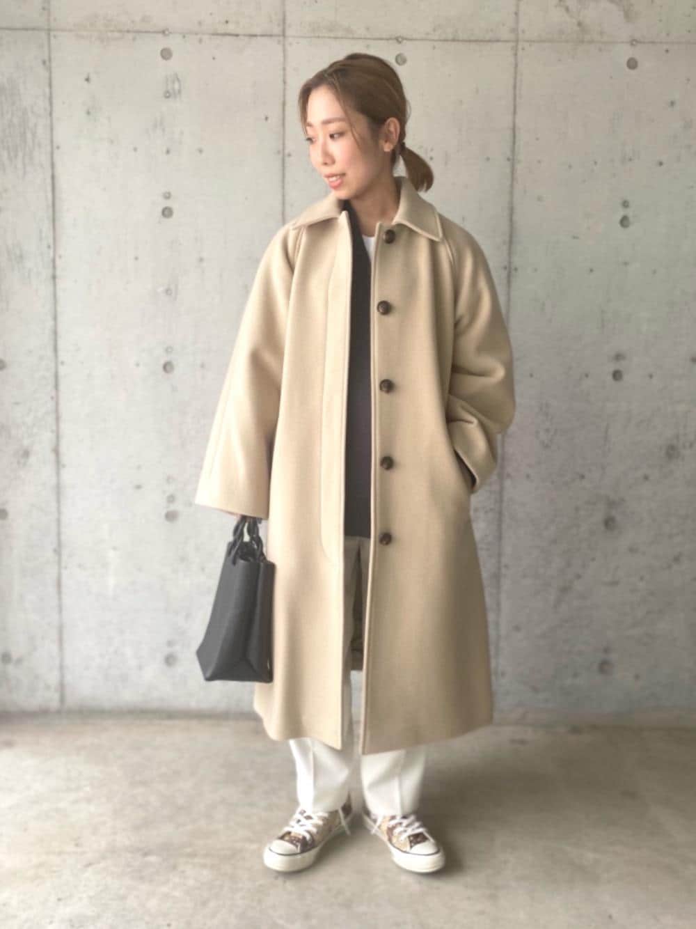 ロング丈でAラインシルエットのコートにはテーパードパンツを合わせ、すっきりとした印象にしました。