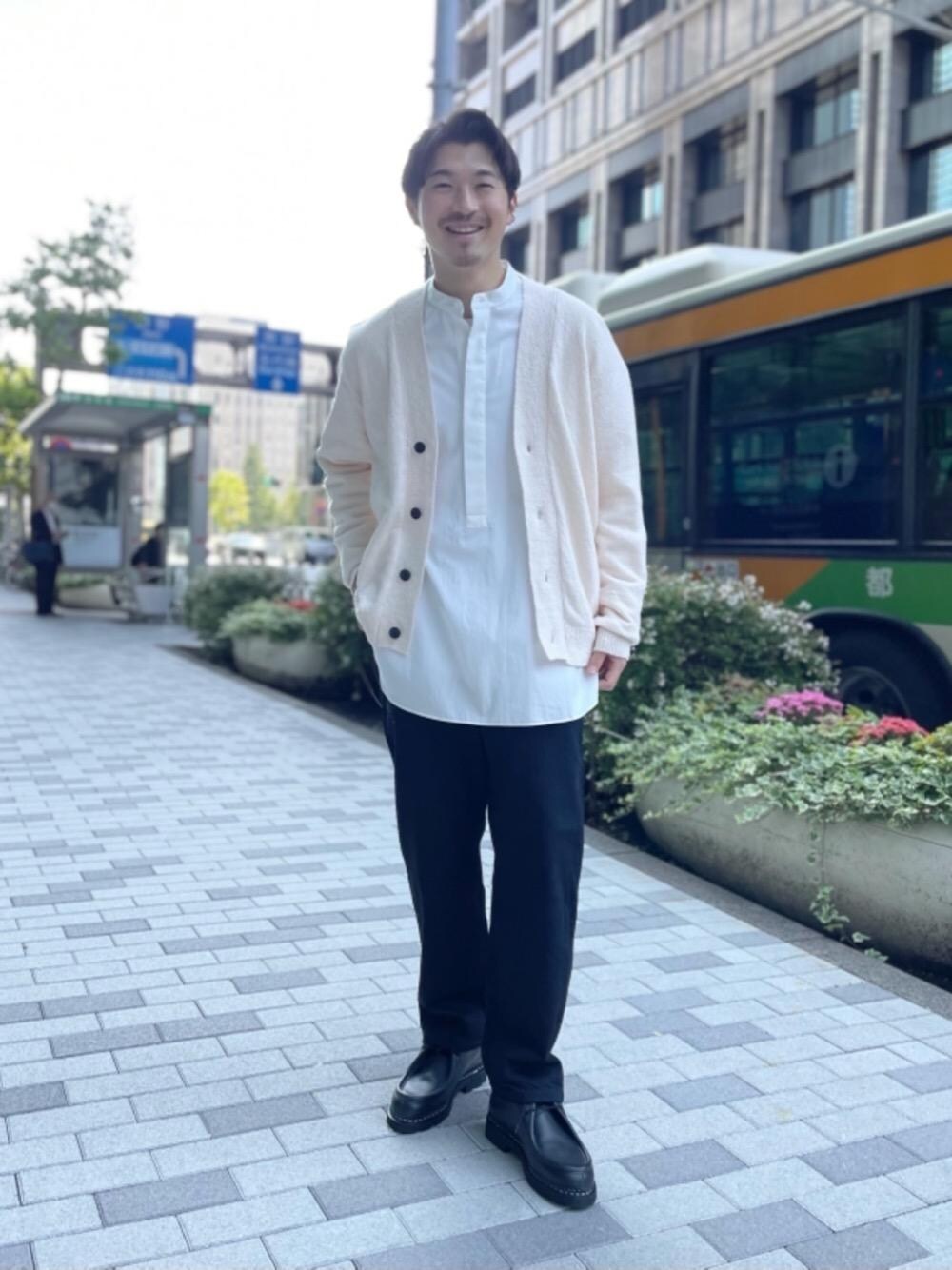 【身長】 173㎝ 【普段サイズ】 アウター:M トップス:M(or L) ボトムス:M(or S),46(or 48) シューズ:26.0㎝-26.5㎝,6h-7,40h-41 【サイズ感・素材感】 ・カーディガン 標準的なサイズ。 ・シャツ 大きめ、着丈が長い。ハリのある生地感 ・ボトムス ウエスト標準、全体のシルエットはゆとりがある。 ・シューズ 標準的。やや大きめに履き、靴下で調整がオススメ。 【コーディネートポイント】 カーディガンに着丈の長いシャツをインナー使いしレイヤードスタイルに。 中に着ることも想定した為カーディガンはサイズをあげてトレンド感を演出致しました。 トップスのボリューム感に負けないようにシューズはブーツで。