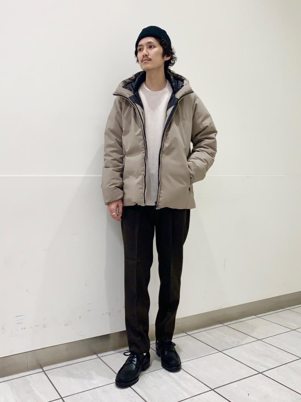 【身長】 180cm 【普段サイズ】 トップス : L or XL / ボトムス : L or XL シューズ : 28 or 28.5cm 【サイズ感や素材感、シルエット、着心地etc…】 アウター : 着用サイズ XL / スッキリとしたシルエット / 表面がシャンブレー生地なのでスポーティーになりすぎず、ニット等のキレイ目アイテムとの相性が良いです。700フィルパワーのダウンも搭載し機能性も兼ね備えてます。 ニット : 着用サイズ XL /ウール 100% / 程よくゆとりのあるシルエット / ミドルゲージでカジュアルすぎず、スラックス等のアイテムとの相性も良いです。イタリアメーカーの上質な生地を採用し、柔らかくて発色がとても良いです。 パンツ : 着用サイズ XL / ポリエステル 100% /適度なゆとりのテーパードシルエット / 化繊素材でツイード感を表現し、軽くて硬さもないので履き心地が良いです。アンクル丈でスニーカーでも相性が良いです。 シューズ : 着用サイズ 9 / ボックスカーフ / 普段着用のスニーカーサイズより1cm程下げての着用がオススメです。 【コーディネートポイント】 BEAUTY&YOUTH定番のダウンアウターをニットやスラックスでキレイ目な合わせにしつつ、ベージュ系を主体とした色合わせ、サイズ感をやや緩めに着用することで、今季らしい雰囲気にまとめました。