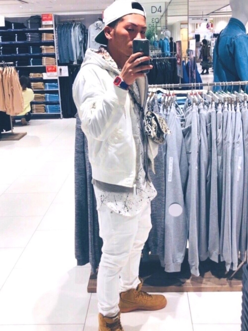 白レイヤードコーデ! スニーカーに使いやすいWHEAT色 パーカーはグレーでバランスとったけど、スニーカーは素直に白でも良かったっぽい(笑) SHARK × STUSSYの時計のオモチャ感がお気に入り!^^