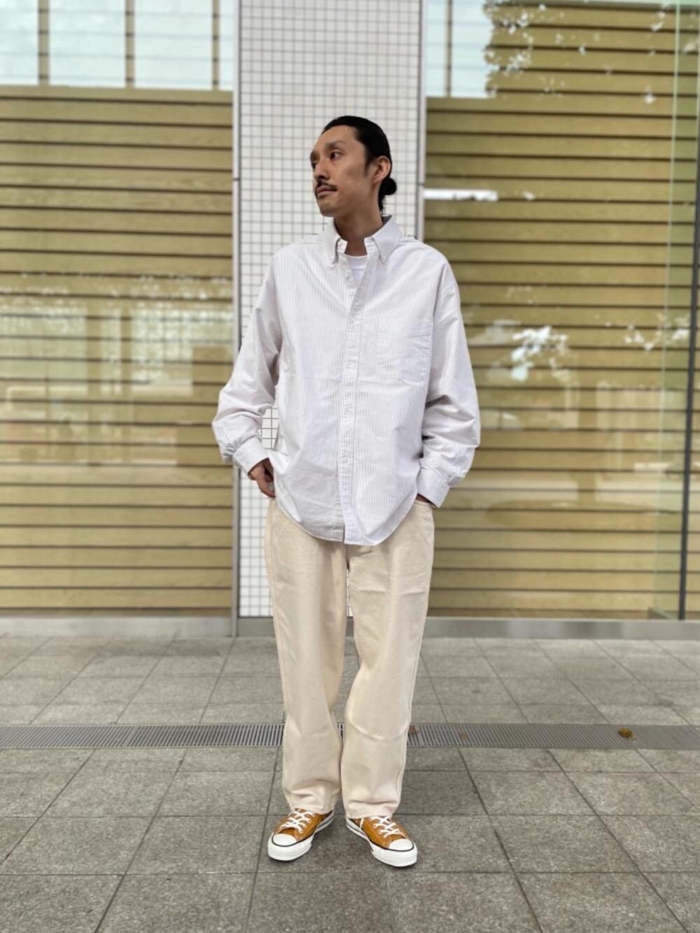 ●年齢:30 ●身長:180cm ●普段サイズ:XL/シューズ27cm 【サイズ感】 トップス:ゆったり ボトムス:太め 【素材感】 シャツ、パンツ共にしっかり目の綿素材 【コーディネートポイント】 派手になりすぎないキャンディストライプのシャツがポイント。 秋らしくベージュワントーンに。