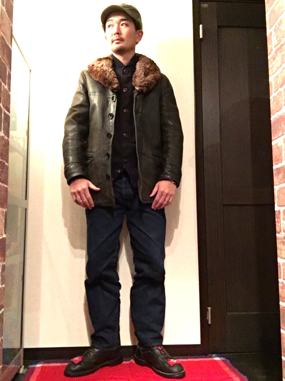 【原点に戻るスタイル】 お久しぶりです。一年半位探して見つかったので、記念スタイルです。又のスタイルを、_復刻にもこだわりを_です。 頭の奴は耳あて付き89年製造US ARMYコンバットcapです。 ウールの暖かいのは50s猫目ボタン、ウールボタスタです。昨日フリマで500円でした。久々にビビッとこの感じ。だから古着は良い。 馬革のカーコートは40s袖の裏地は中途半端にボロかったので、ちぎって捨てたりました。リアルラビットファーが気持ちよく暖めてくれたりします。 そして、リーバイスさんより、96年9月に製造されたバレンシア工場製造501xx 55年モデル。コイツをずーっと探していました。洗いかかってたんで、糊付けて久々に育てています。履き潰して買うサイクルも難しくなり、だんだん数が減っています。55年モデルの中でも、この初期の96.97辺りが一番好きな色落ちなんです。はい。最近出ましたが、ビビッと来てません。それが好きな方はそれで良いと思う。 探して探して見つけて、糊付けて、履いて、この感じがたまらない。長くなりましたが、復刻にもこだわりを持って履きたいと思っております。 足元の目立ちたがり屋さんは、ダナーの不明モデル笑笑ですが、ちゃんとゴアテックスです。泥除け革から創り、スタッズも打ち込みました。街行く若僧が見る見る笑笑 腕周りはストップライトを参考に鏨から作ったオリジナル。指輪はメキシカンリング。時計はチュードルイカ針。