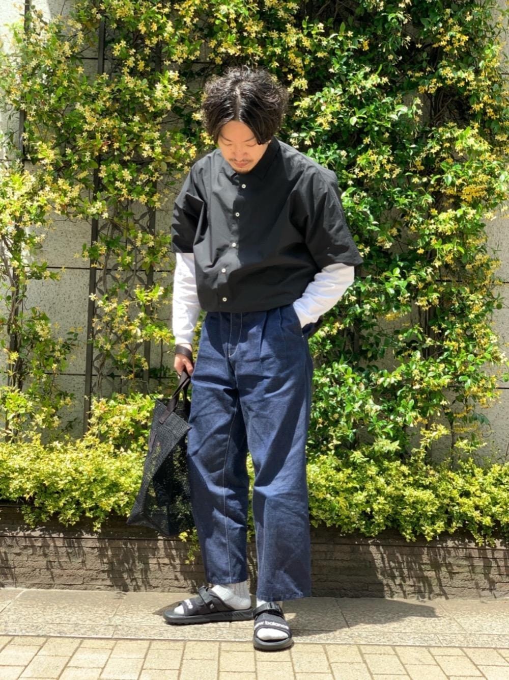 〈EN ROUTE〉のシャツはタイプライター織特有のパリッとしたハリ感とさらっとしている生地なので、暑い夏でも涼しくお召し頂けます。涼しげなメッシュのバッグとサンダルを合わせて爽快なスタイリングにしました。