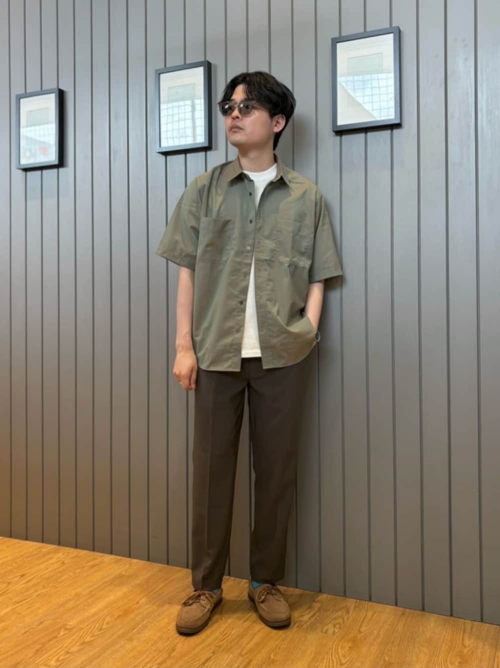 普段のサイズ トップス・基本L(サイズ感次第でXL.M) ボトムス・基本L(サイズ感次第でM) シューズ・27.5cm 【着用サイズ、サイズ感】 シャツ・Lサイズ/ 適度なゆとり感。 インナー・Mサイズ/ 適度なゆとり感。 ボトムス・Lサイズ/ 適度なゆとり感。 シューズ・9(27cm) / 標準的。 【コーディネートポイント】 発色が綺麗なオリーブ色のシャツを主役に、アースカラーで合わせたシャツスタイル。 足元はデッキシューズで大人カジュアルに。