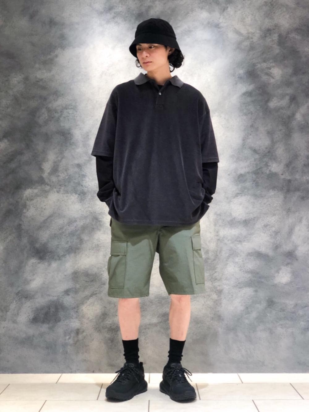 【身長】 170cm(痩せ型) 【通常サイズ】 ・トップスM ・パンツS / デニム30inch ・スニーカー25.5 ~ 26 / レザーシューズ24.5 ~ 25 【サイズ感】 トップス:ゆとりのあるサイズ感。 ショーツ:ウエストはやや広いですがサイドのストラップで調整可能。 【素材感・着心地】 トップス:タオルケット生地の為、柔らかく肌触りも良いです。 ショーツ: ハリ感のある生地です。 【コーディネートポイント】 ゆったりとしたポロシャツなのでインナーに長袖をレイヤードしたスタイリングを組んでみました。全体的なシルエットがルーズな為、ストリートテイストな雰囲気に仕上がっております。